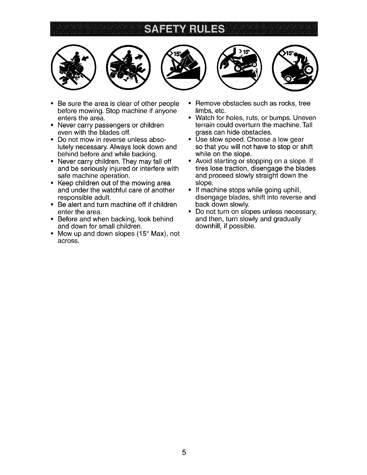 down the face of slopes, never across the face. Do not mow