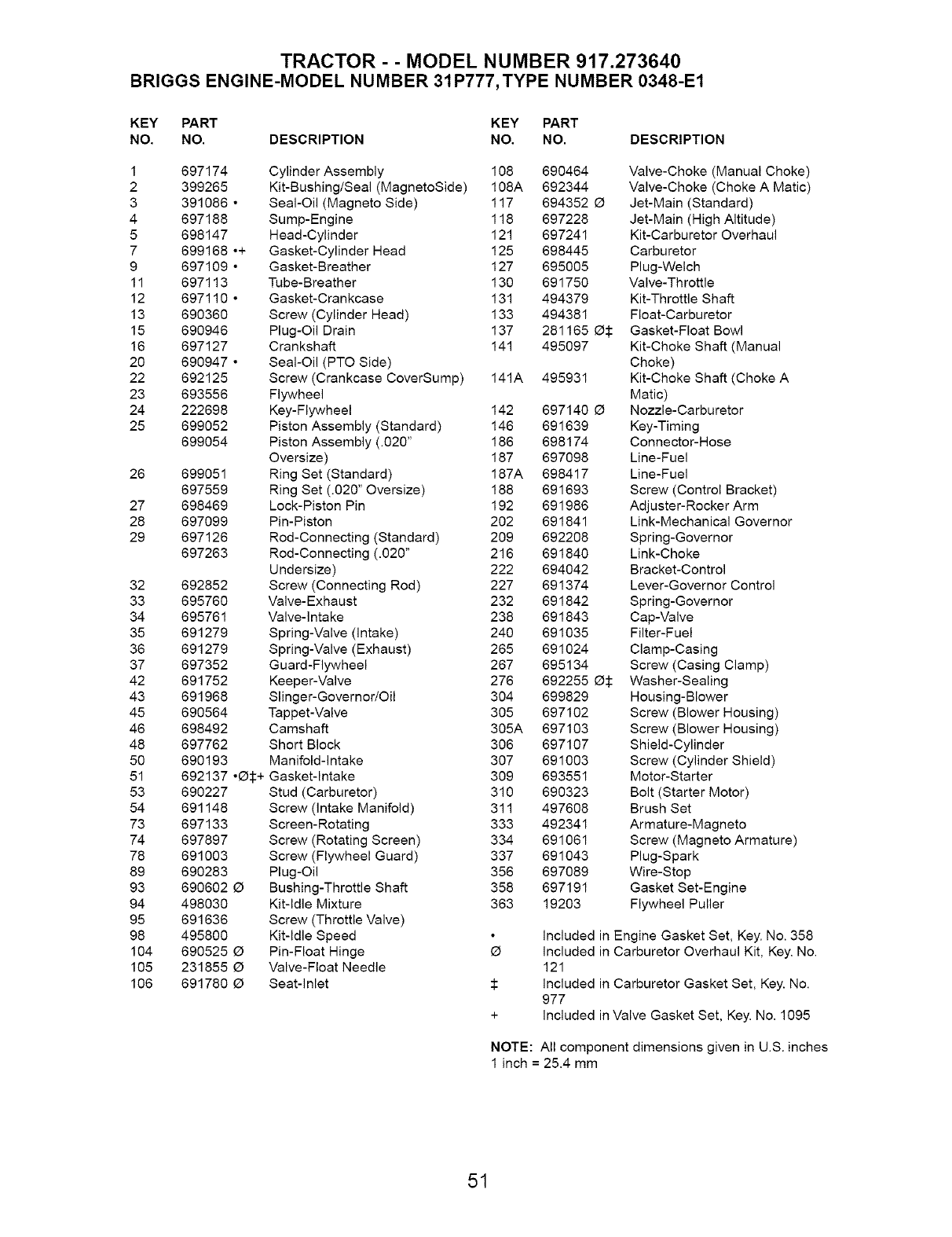 Included in Carburetor Gasket Set, Key. No.