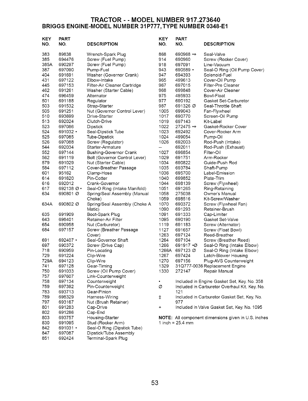 Included in Carburetor Overhaul Kit, Key. No.