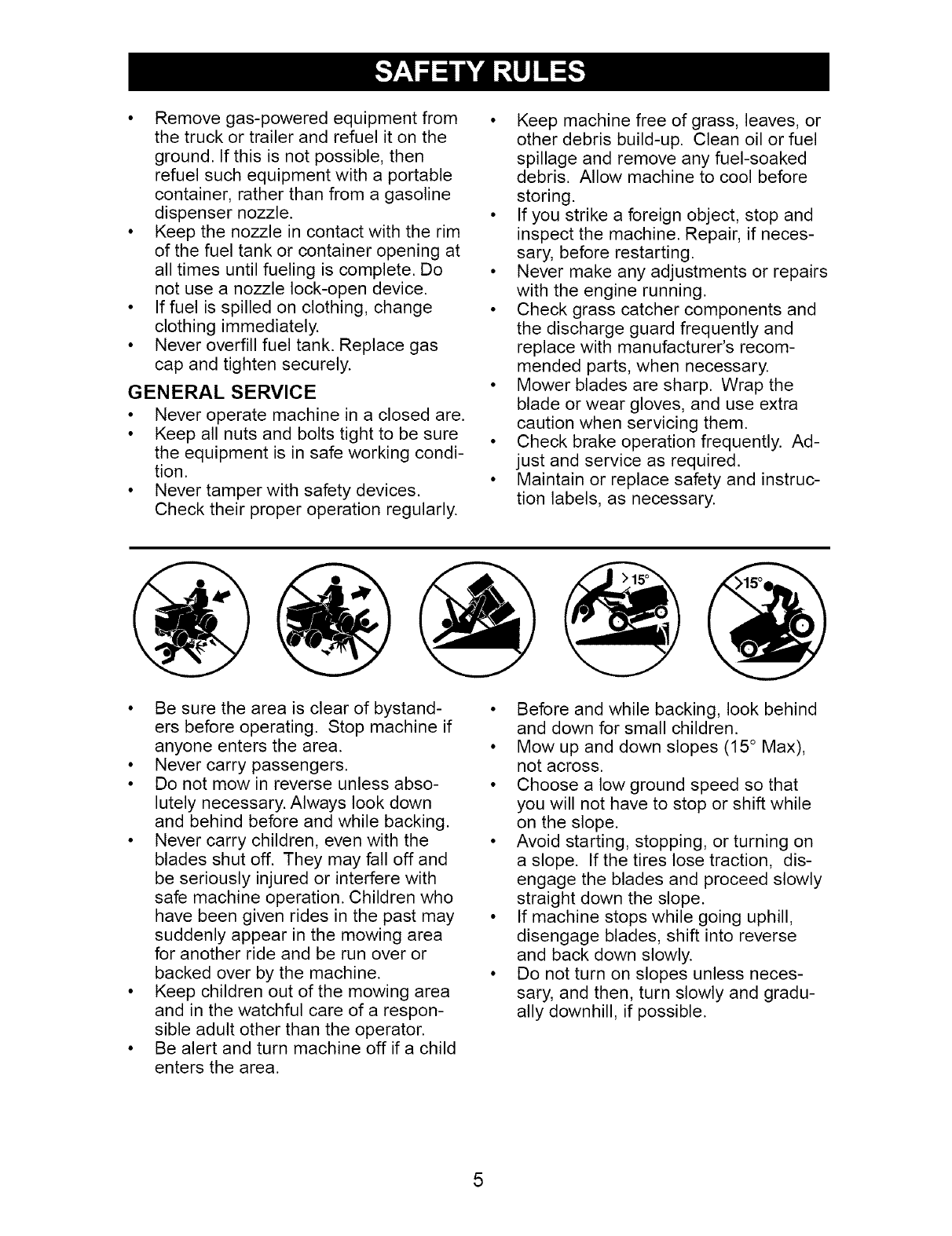 down the face of slopes, never across the face. Do not mow