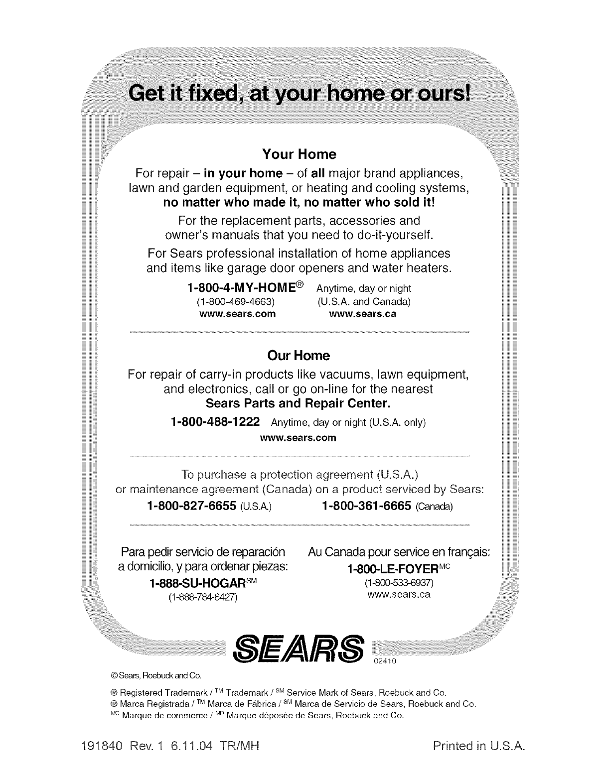 ® Registered Trademark /TMTrademark /SMService Mark of Sears, Roebuck and Co.