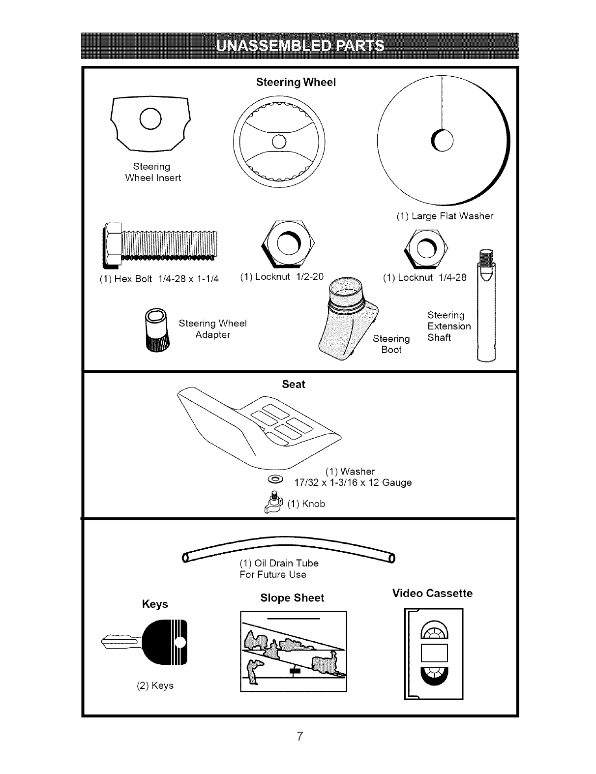 blades, spark plugs, air cleaners, belts, and oil filters.