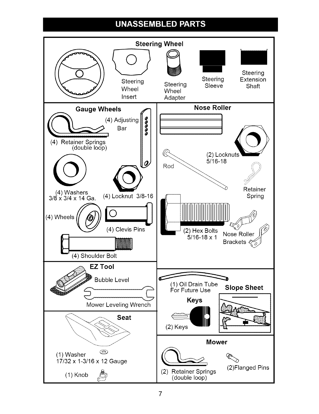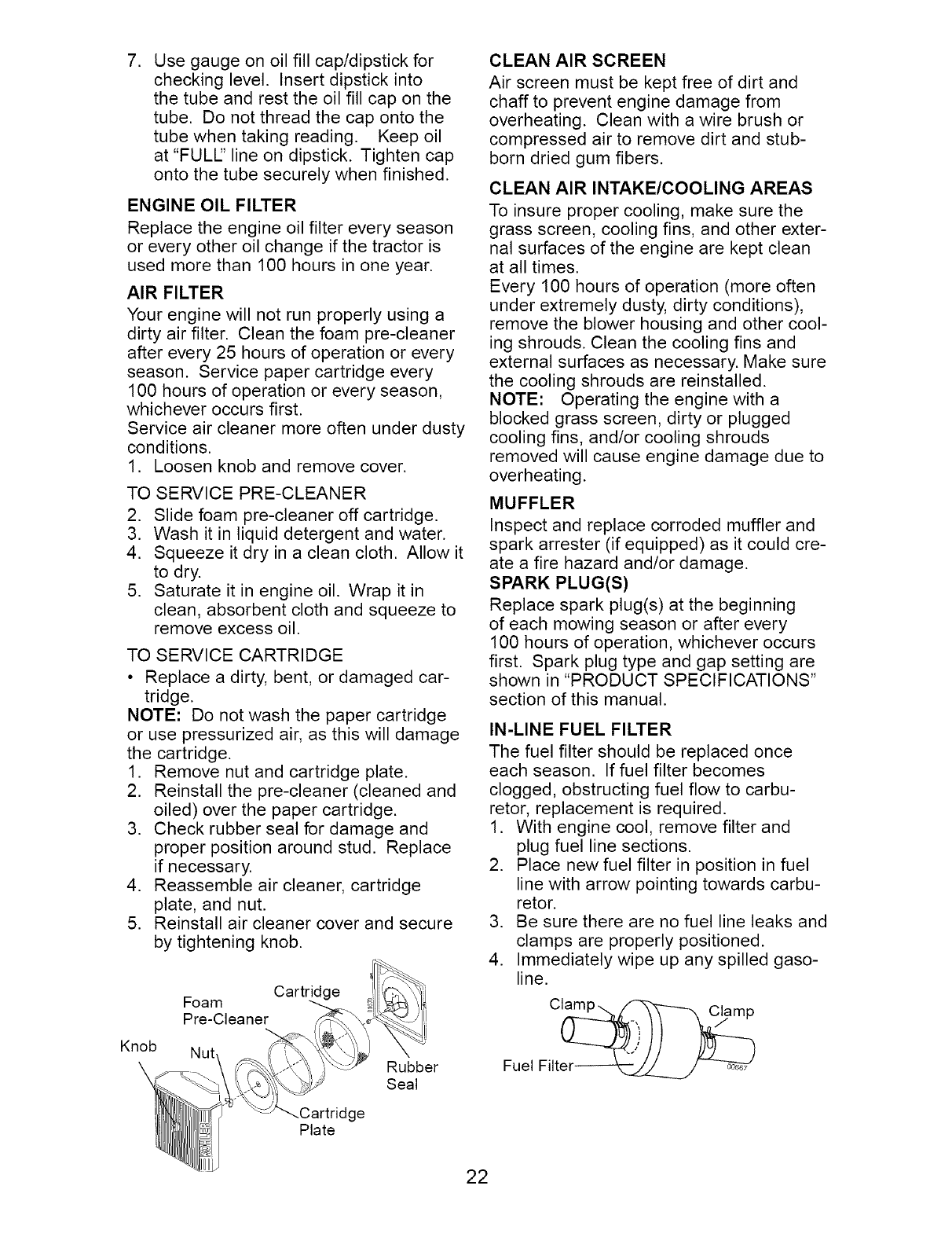 blades, spark plugs, air cleaners, belts, and oil filters.