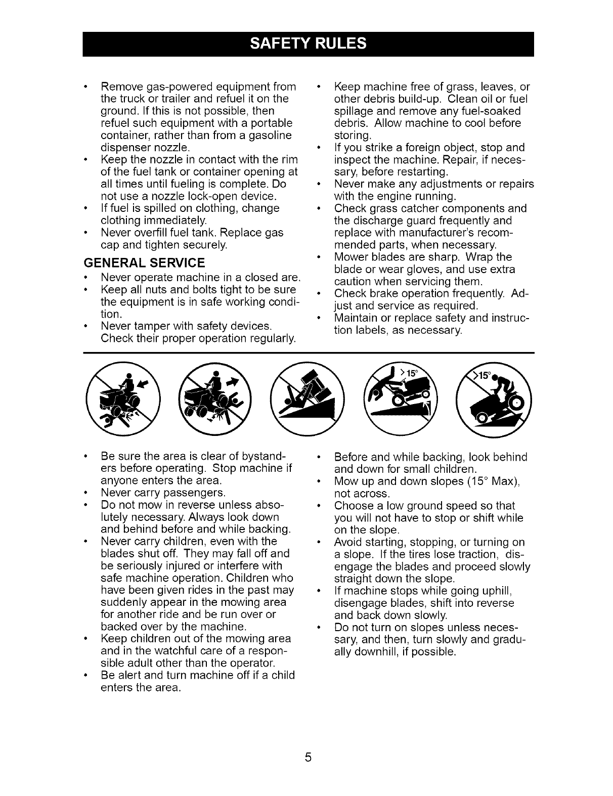 down the face of slopes, never across the face. Do not mow