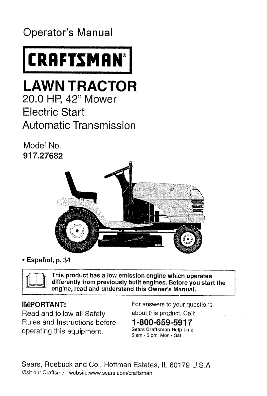 User Manual: Craftsman 917276824 917276824 CRAFTSMAN TRACTOR - Manuals and Guides View the owners manual for your CRAFTSMAN TRACTOR #917276824. Home:Lawn & Garden Parts:Craftsman Parts:Craftsman TRACTOR Manual