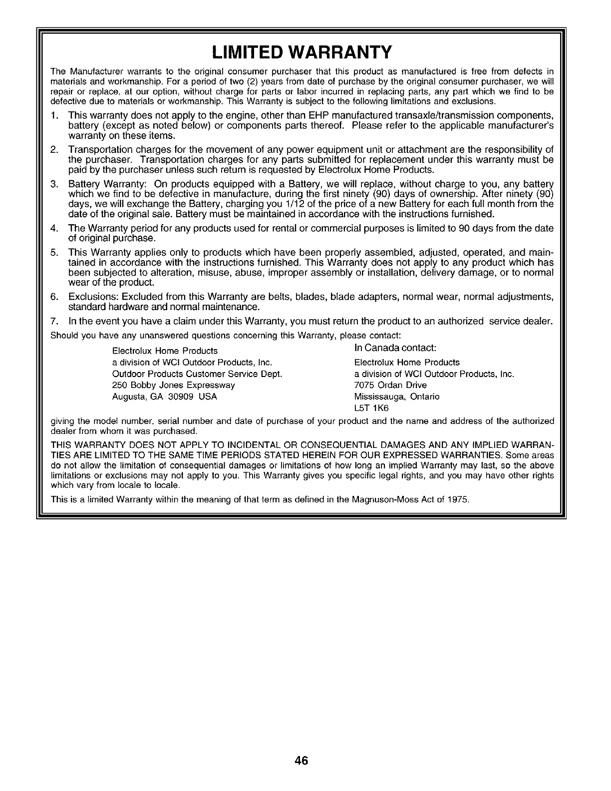 1. This warranty does not apply to the engine, other than EHP manufactured transaxle/transmission components,