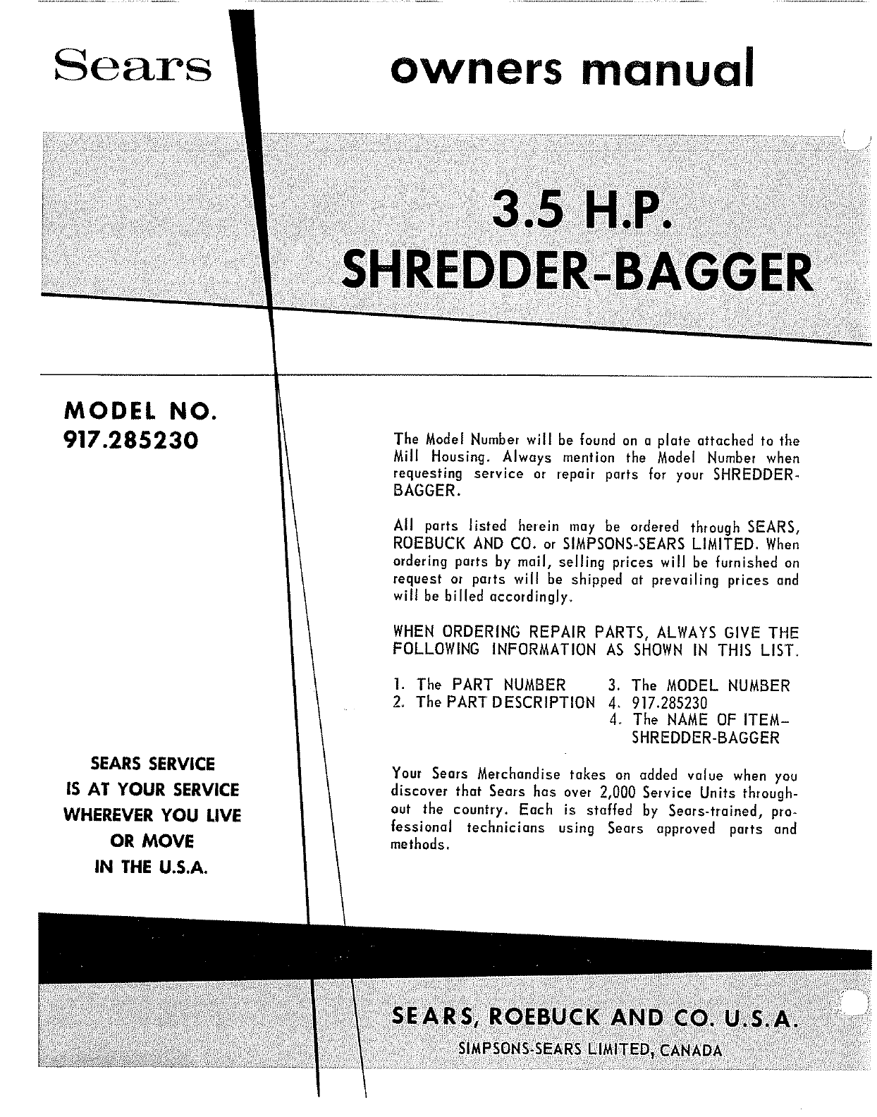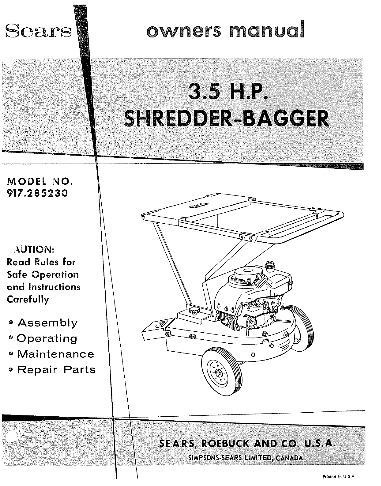 User Manual: Craftsman 917285230 917285230 CRAFTSMAN SEARS SHREDDER-BAGGER - Manuals and Guides View the owners manual for your CRAFTSMAN SEARS SHREDDER-BAGGER #917285230. Home:Lawn & Garden Parts:Craftsman Parts:Craftsman SEARS SHREDDER-BAGGER Manual