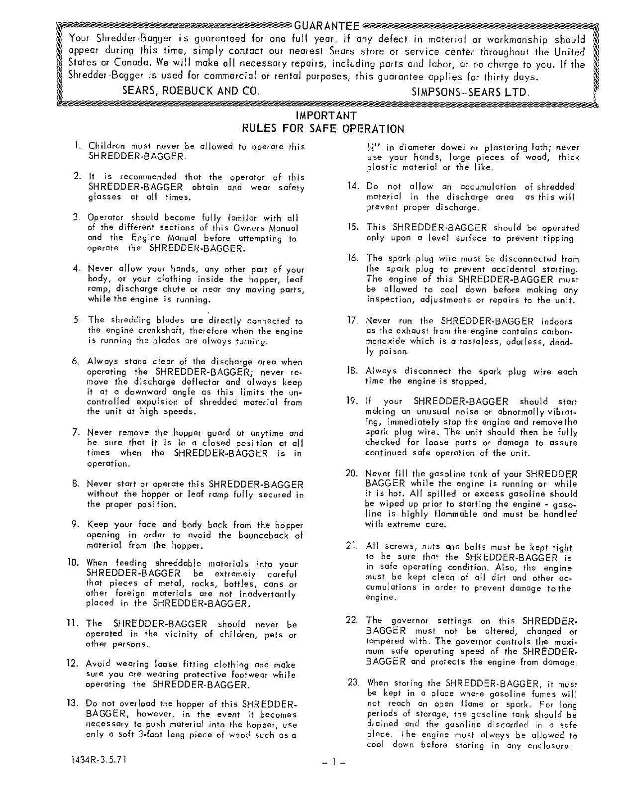 Your Shredder-Bagger is guaranteed for one fuji year. If any defect in material or workmanship should