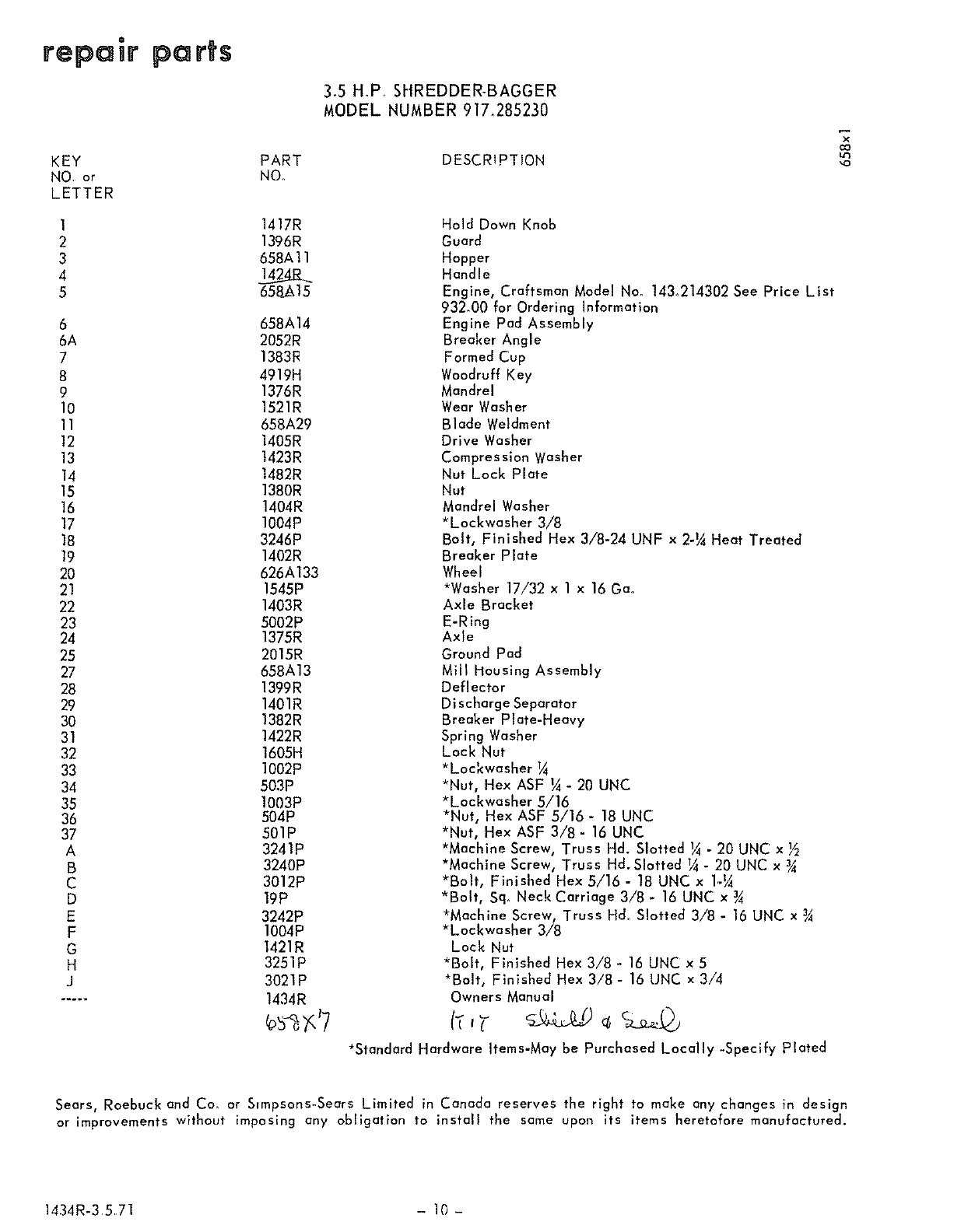 ordering parts by mail, selling prices will be furnished on