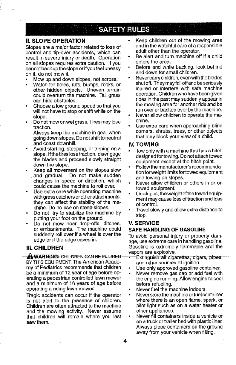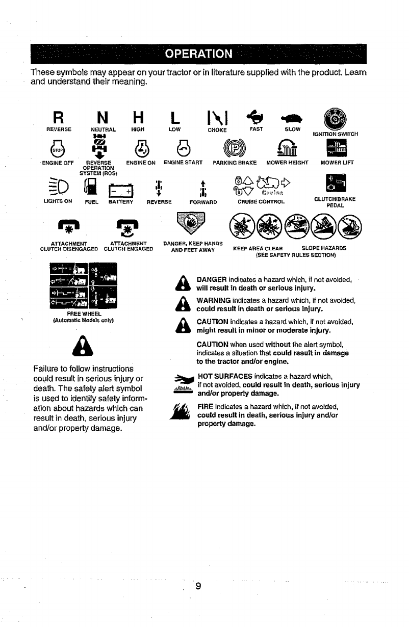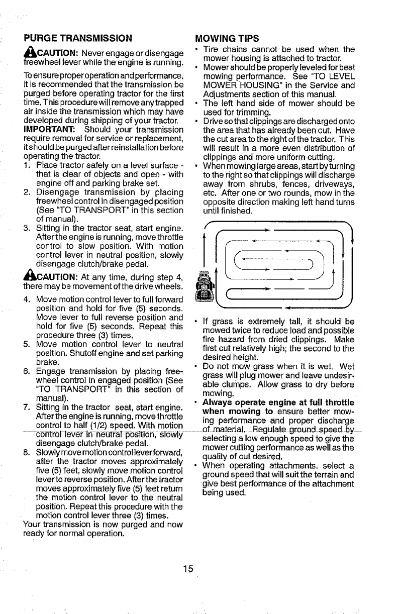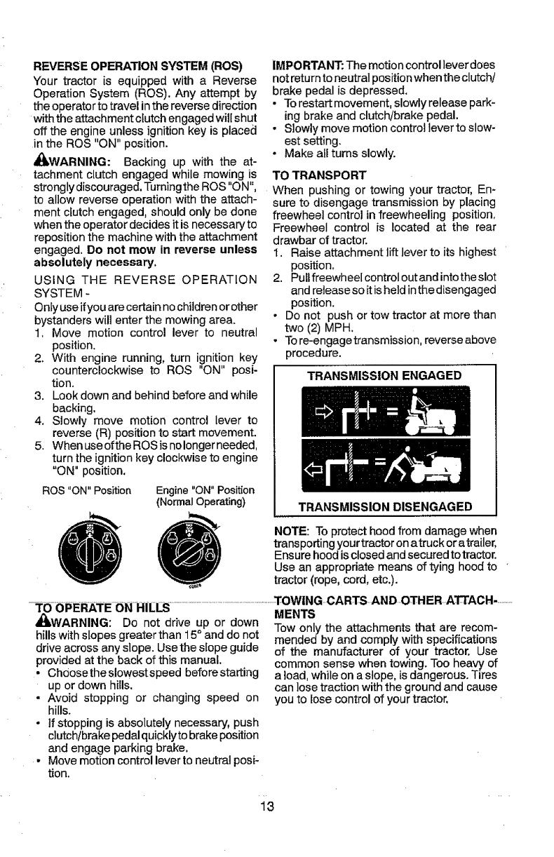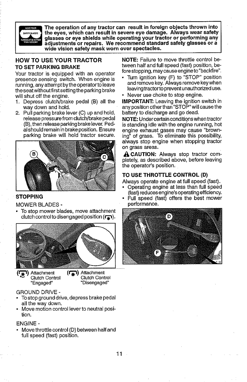 tractor. Use common sense when towing, parking brake, stop engine, and remove