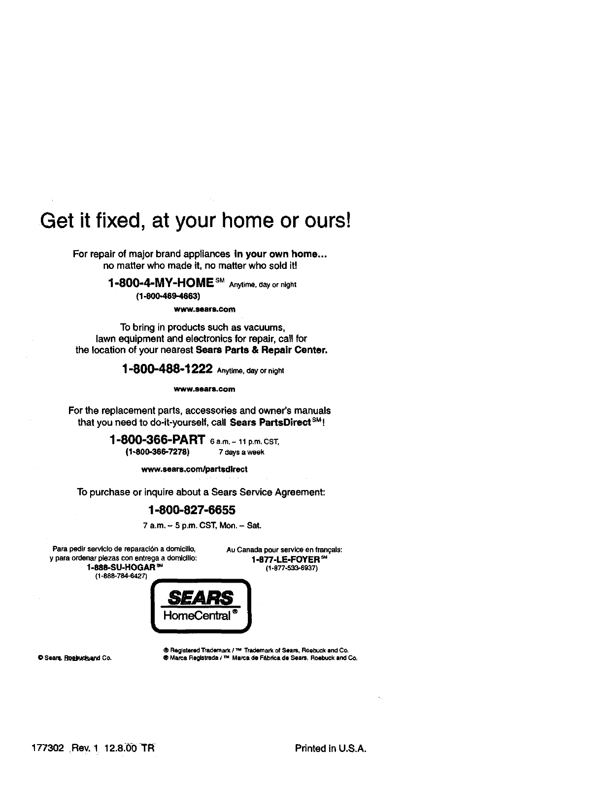 177302 Rev. 1 12.8:00 TR Printed in U.S.A.