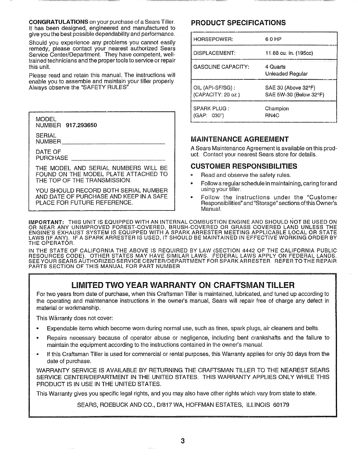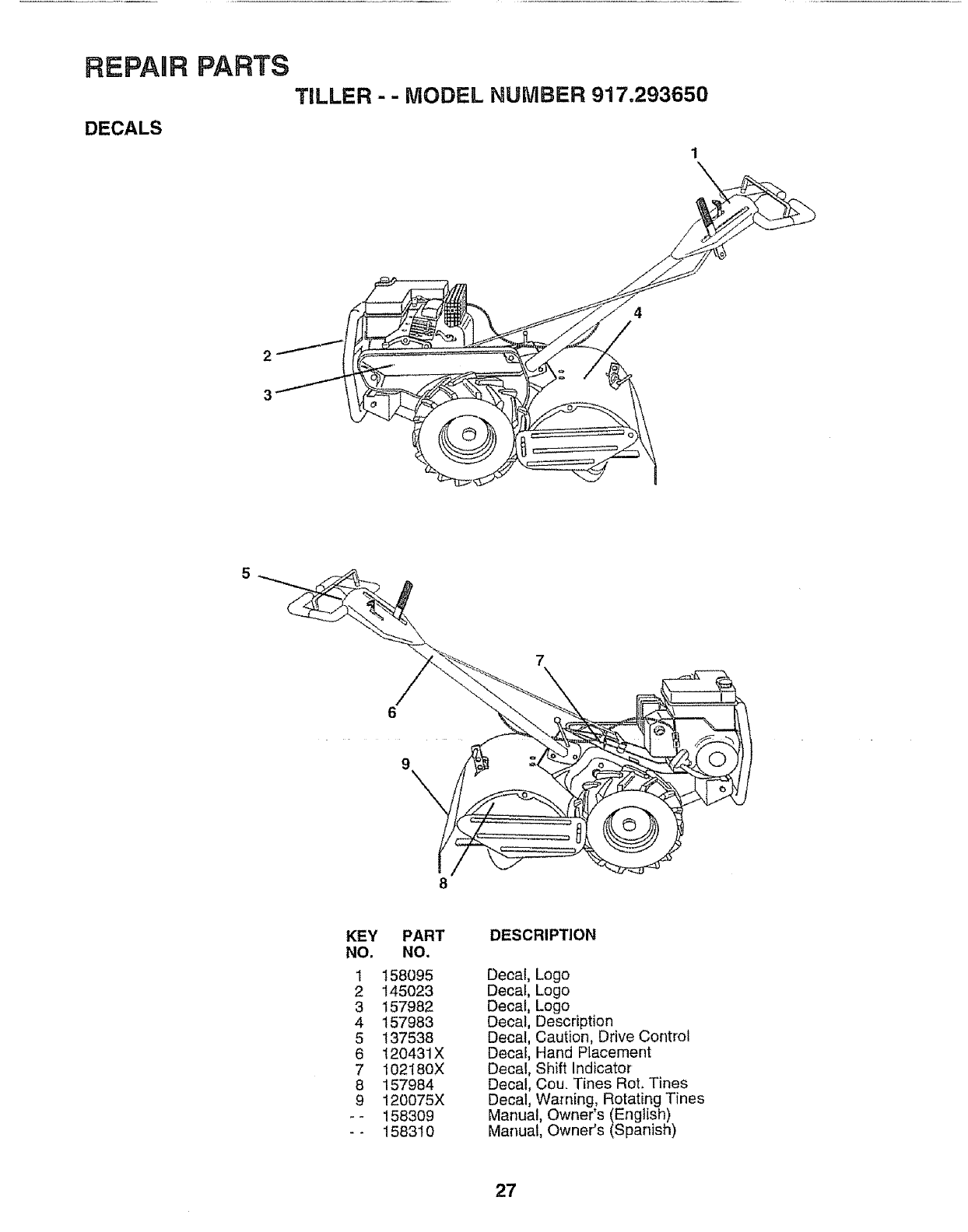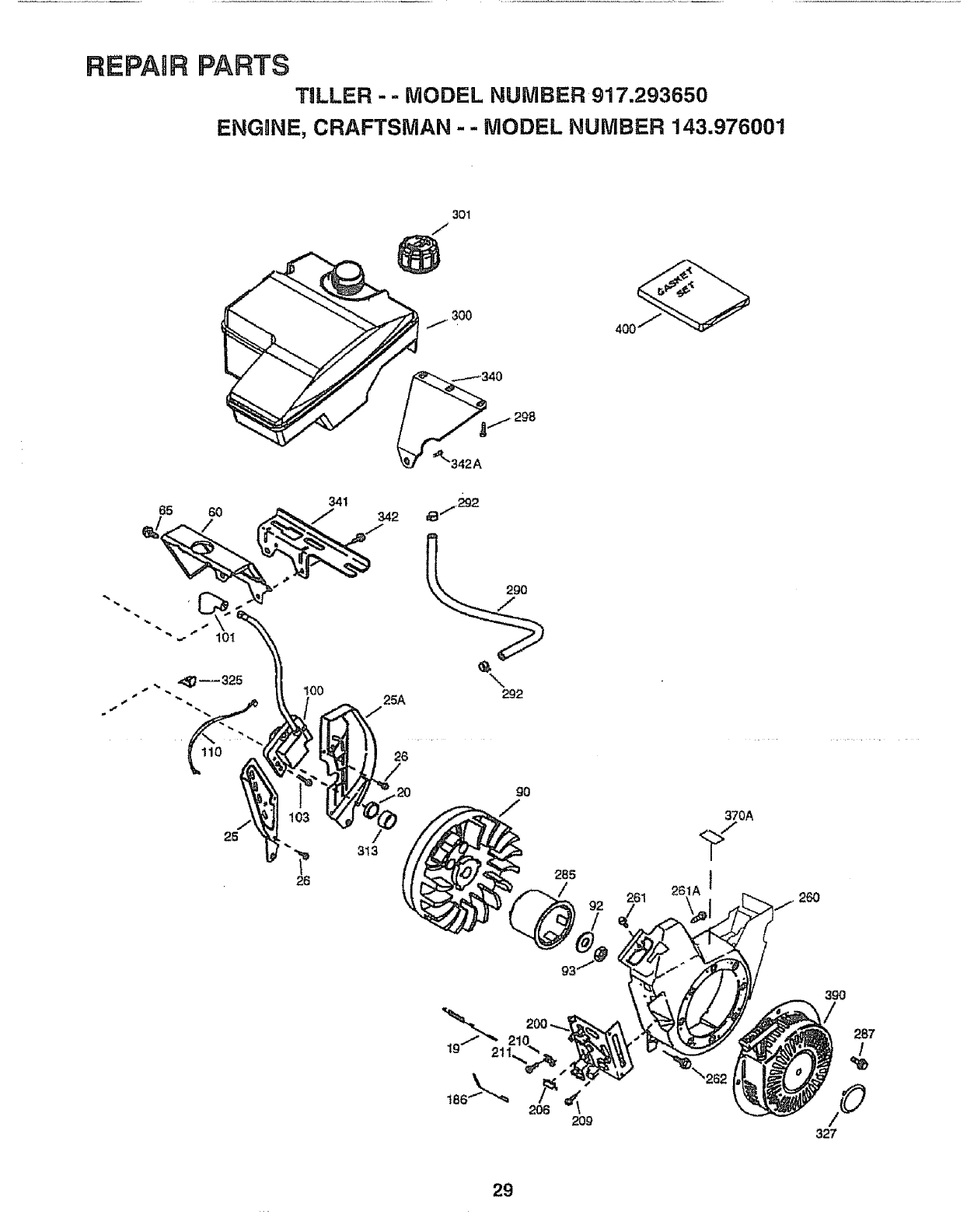 User Manual: Craftsman 917293650 917293650 CRAFTSMAN Rear Tine, Gas Tiller - Manuals and Guides View the owners manual for your CRAFTSMAN Rear Tine, Gas Tiller #917293650. Home:Lawn & Garden Parts:Craftsman Parts:Craftsman Rear Tine, Gas Tiller Manual