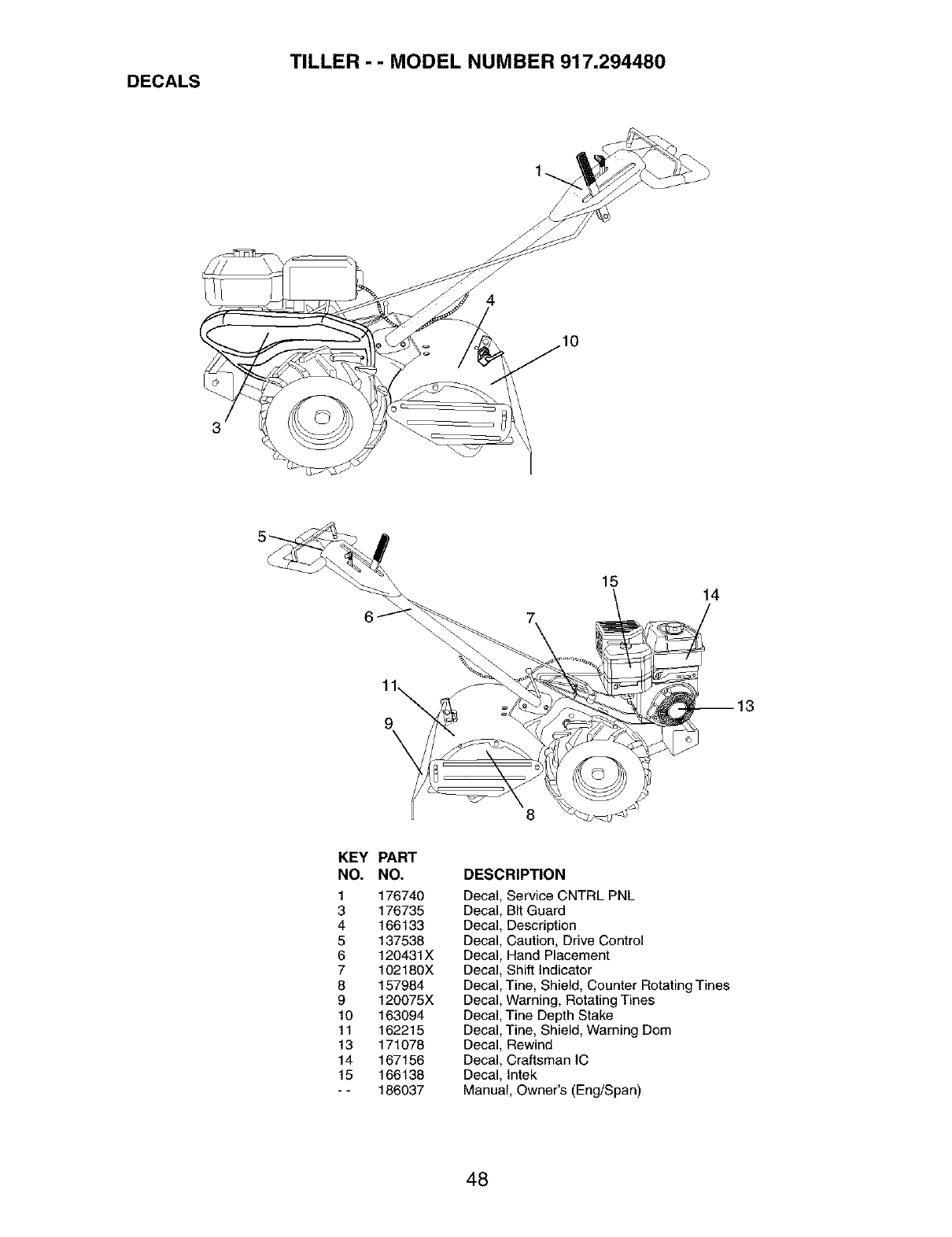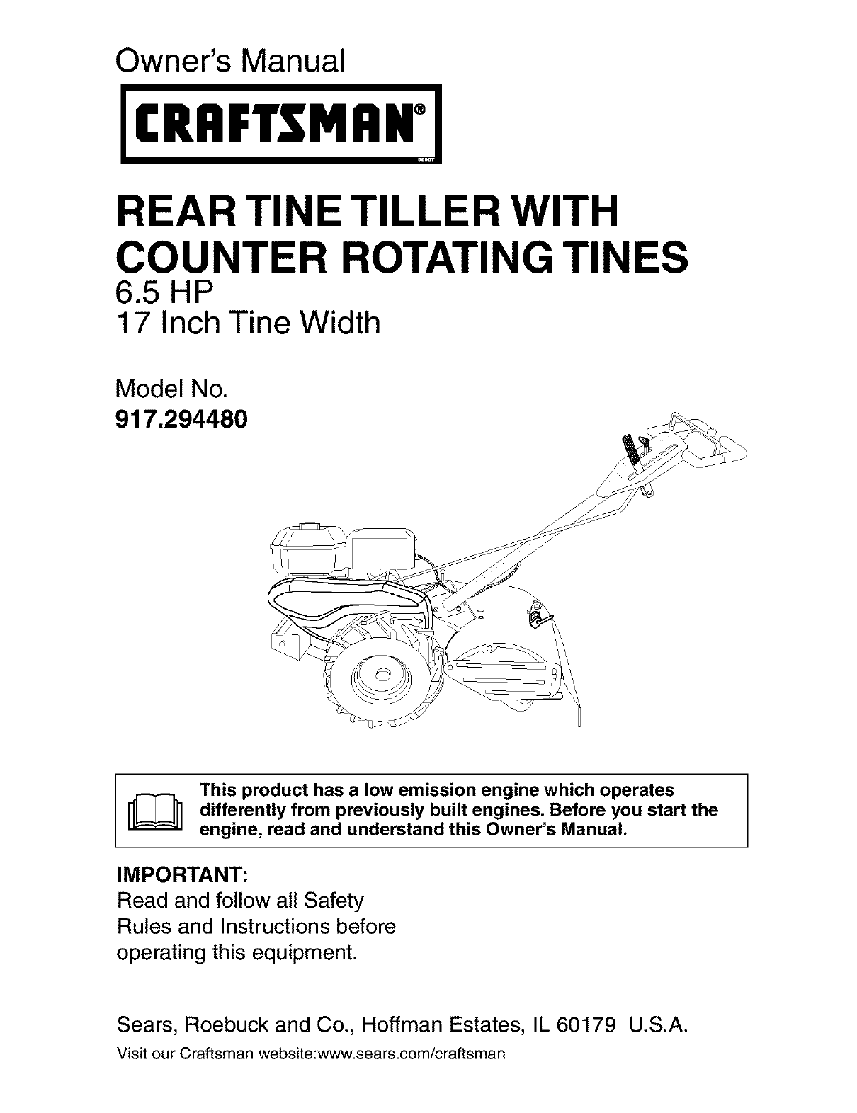 User Manual: Craftsman 917294480 917294480 CRAFTSMAN TILLER - Manuals and Guides View the owners manual for your CRAFTSMAN TILLER #917294480. Home:Lawn & Garden Parts:Craftsman Parts:Craftsman TILLER Manual