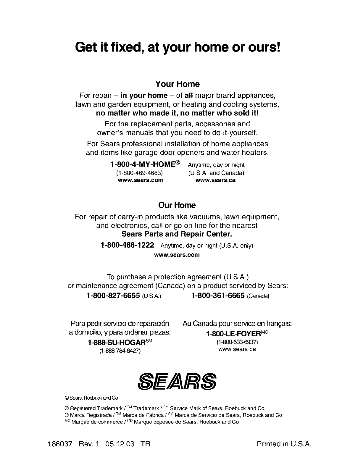 186037 Rev. 1 05.12.03 TR Printed in U.S.A.