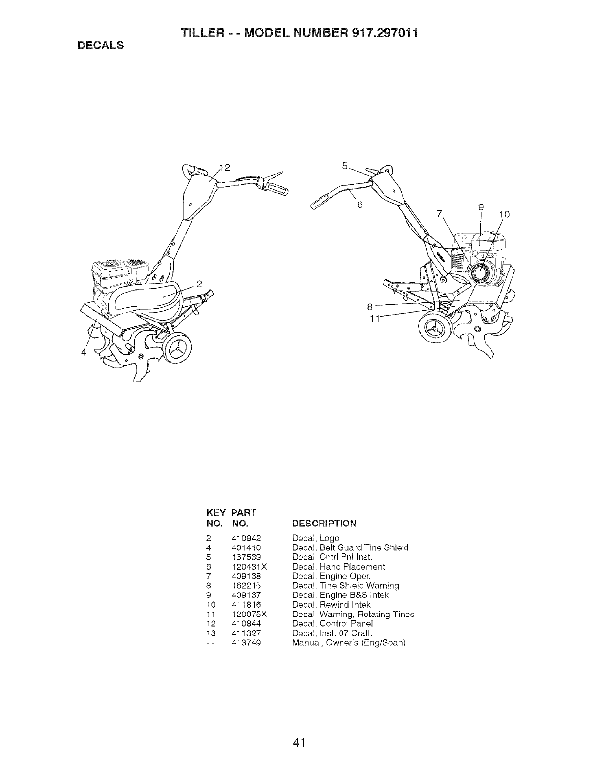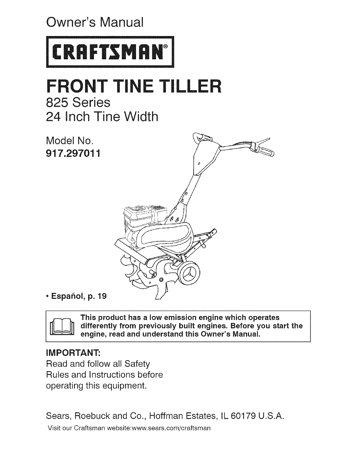 User Manual: Craftsman 917297011 917297011 CRAFTSMAN TILLER - Manuals and Guides View the owners manual for your CRAFTSMAN TILLER #917297011. Home:Lawn & Garden Parts:Craftsman Parts:Craftsman TILLER Manual