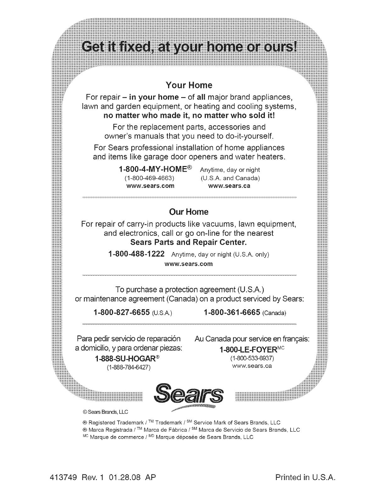 ® Registered Trademark /TM Trademark /SMService Mark of Sears Brands, LLC