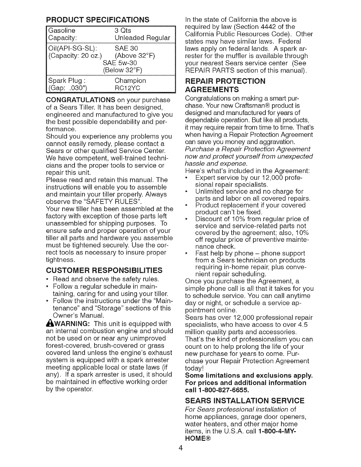 CRAFTSMAN Front Tine, Gas Tiller Manual L0802612 CRAFTSMAN Front Tine, Gas Tiller Owner's Manual, CRAFTSMAN Front Tine, Gas Tiller installation guides