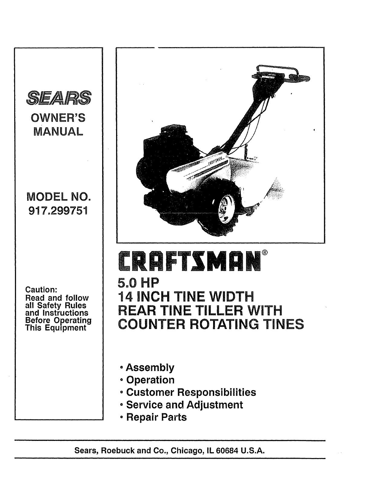 User Manual: Craftsman 917299751 917299751 CRAFTSMAN TILLER - Manuals and Guides View the owners manual for your CRAFTSMAN TILLER #917299751. Home:Lawn & Garden Parts:Craftsman Parts:Craftsman TILLER Manual