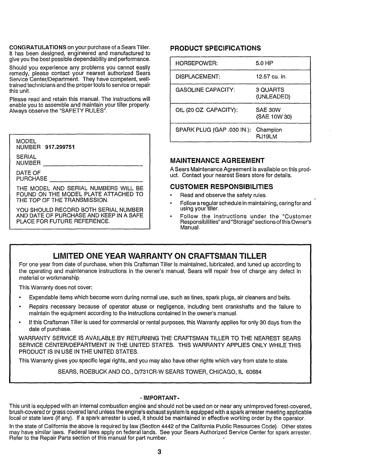 Craftsman 917299751 User Manual TILLER Manuals And Guides 1007795L