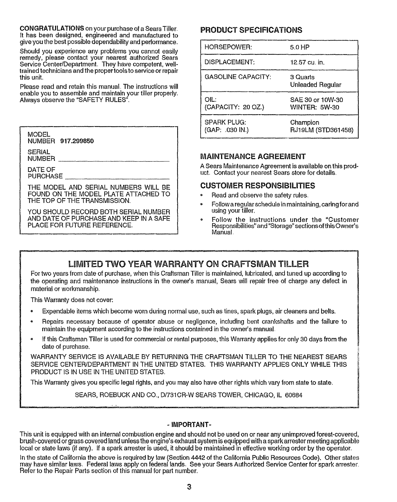 User Manual: Craftsman 917299850 917299850 CRAFTSMAN Rear Tine, Gas Tiller - Manuals and Guides View the owners manual for your CRAFTSMAN Rear Tine, Gas Tiller #917299850. Home:Lawn & Garden Parts:Craftsman Parts:Craftsman Rear Tine, Gas Tiller Manual
