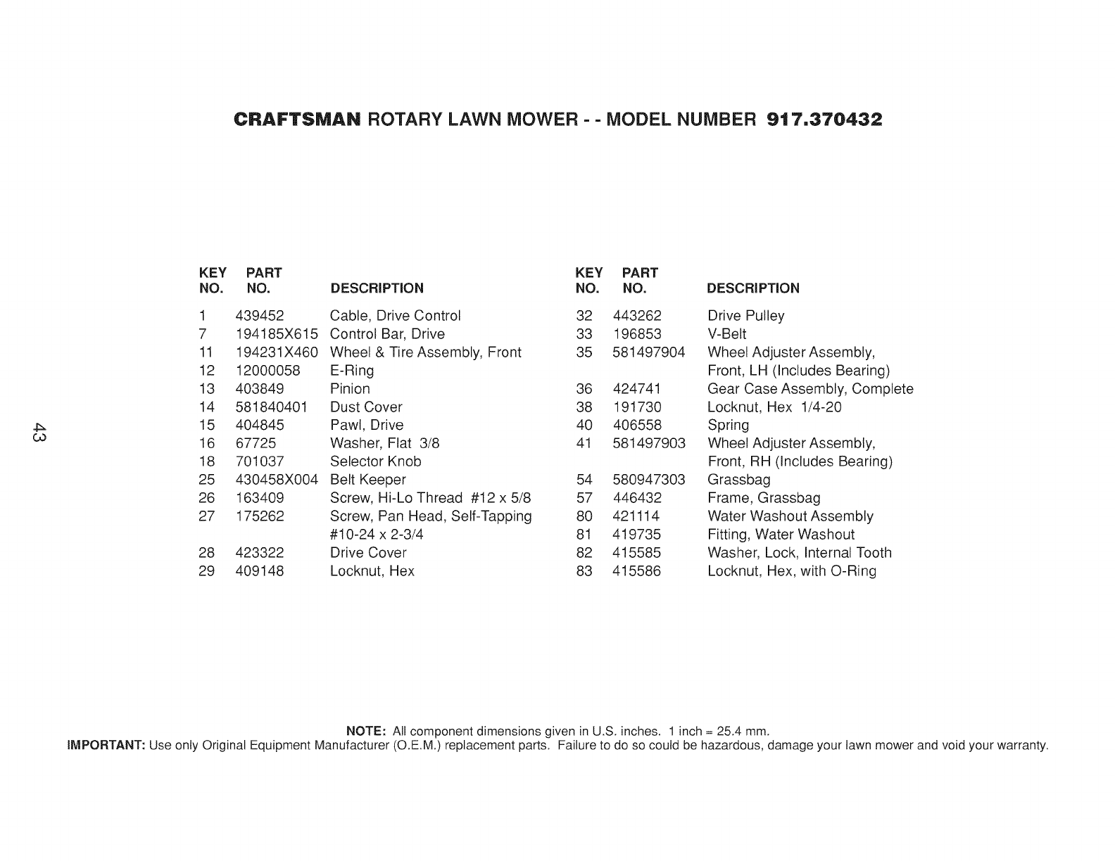 User Manual: Craftsman 917370432 917370432 CRAFTSMAN MOWER - Manuals and Guides View the owners manual for your CRAFTSMAN MOWER #917370432. Home:Lawn & Garden Parts:Craftsman Parts:Craftsman MOWER Manual