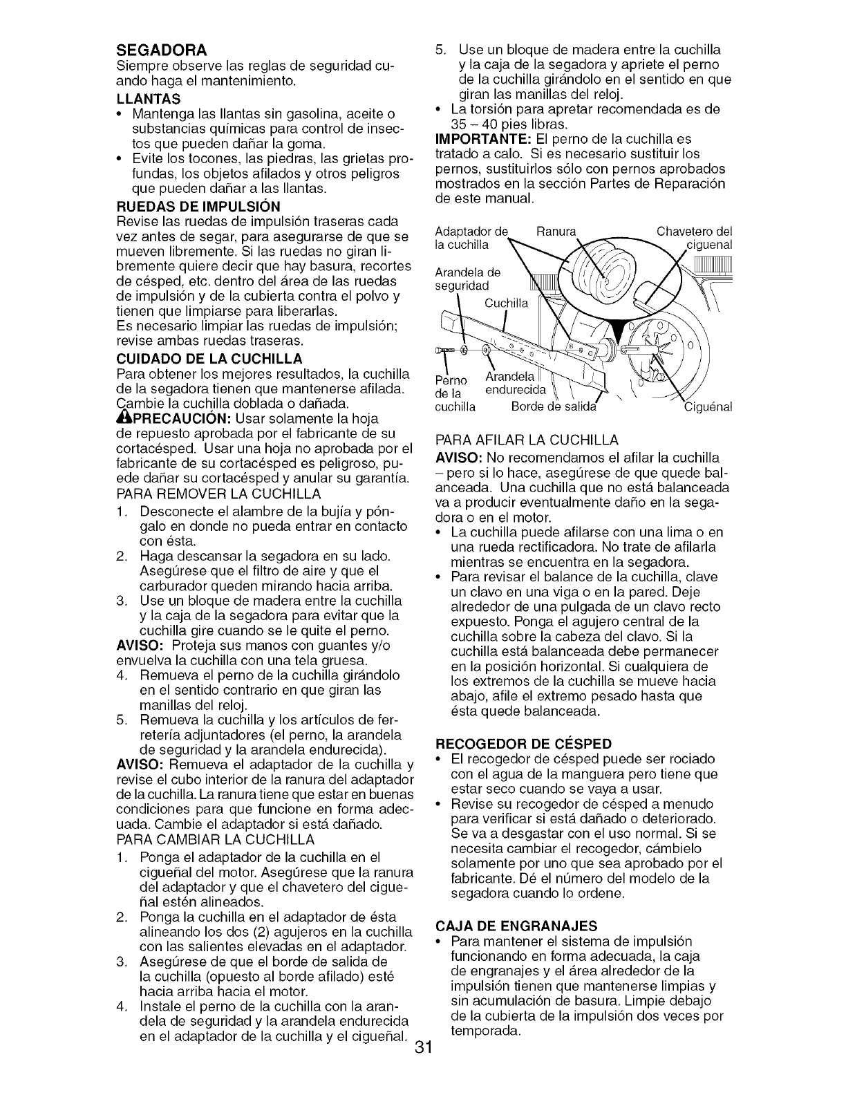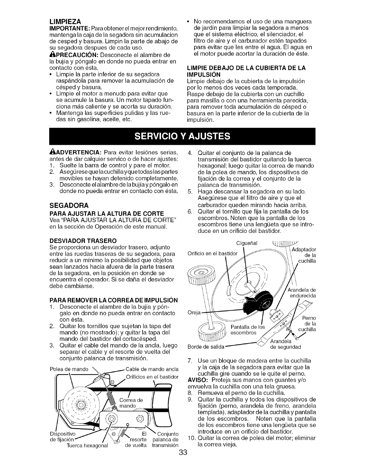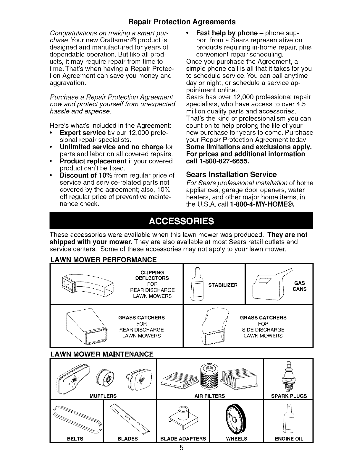 blades, blade adapters, belts, air cleaners and spark plug.