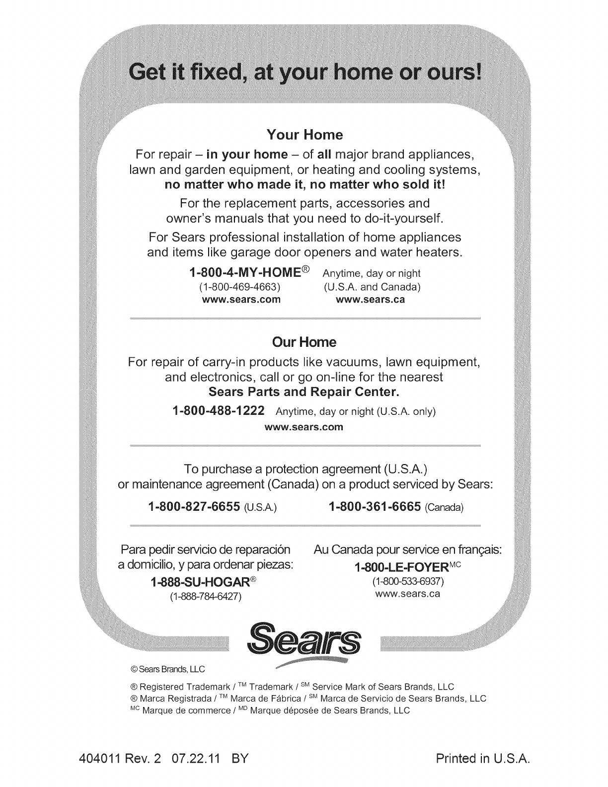 ® Marca Registrada /TMMarca de Fabrica /SMMarca de Servicio de Sears Brands, LLC
