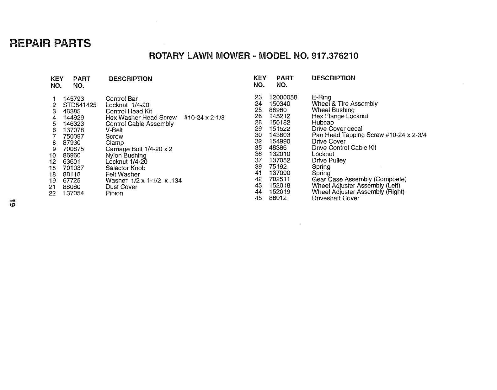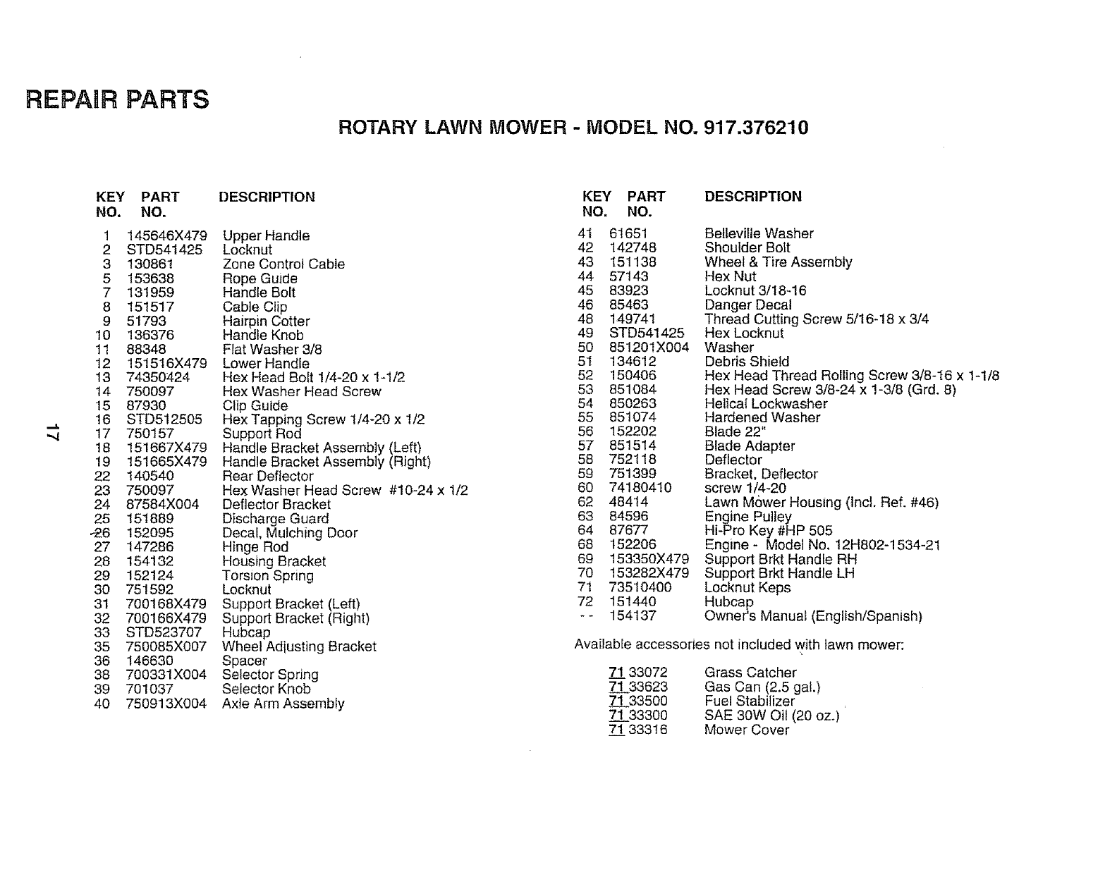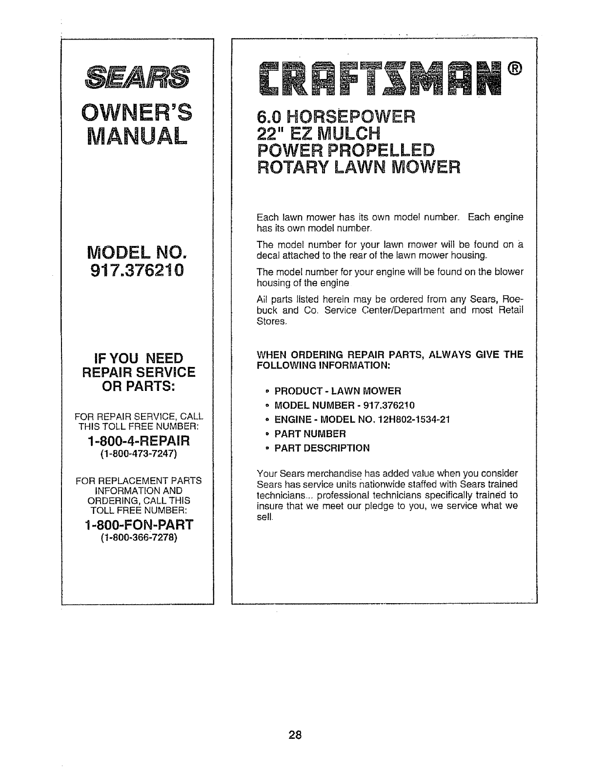 User Manual: Craftsman 917376210 917376210 CRAFTSMAN ROTARY LAWN MOWER - Manuals and Guides View the owners manual for your CRAFTSMAN ROTARY LAWN MOWER #917376210. Home:Lawn & Garden Parts:Craftsman Parts:Craftsman ROTARY LAWN MOWER Manual
