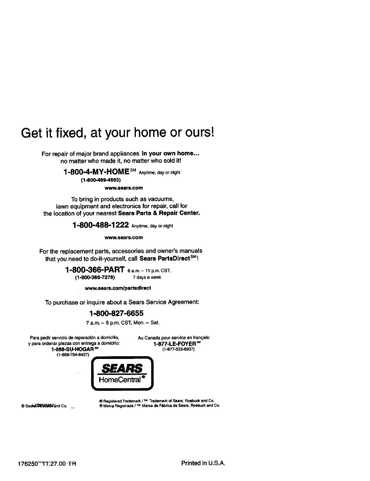 O Sed_d_d Co. ®RegisteredTrademark /T. Trademark of Sears, Roebuckand Co.
