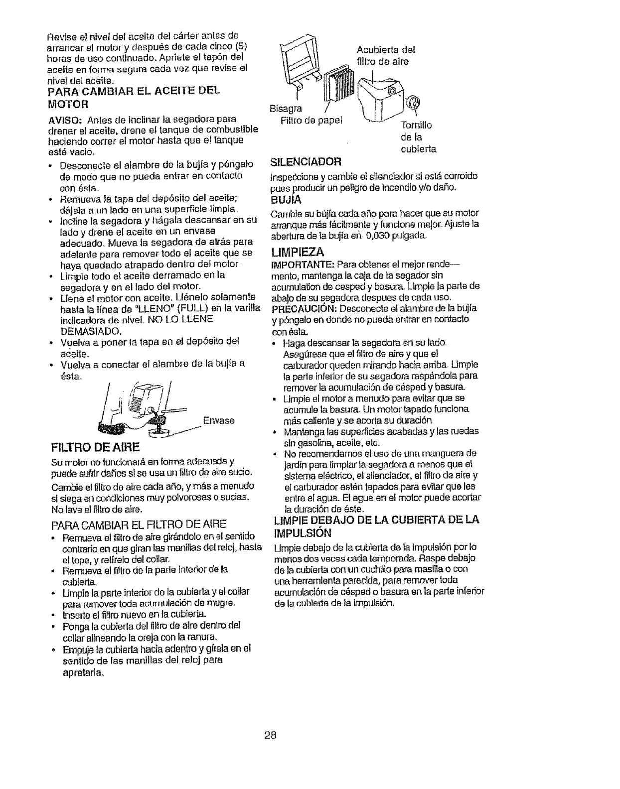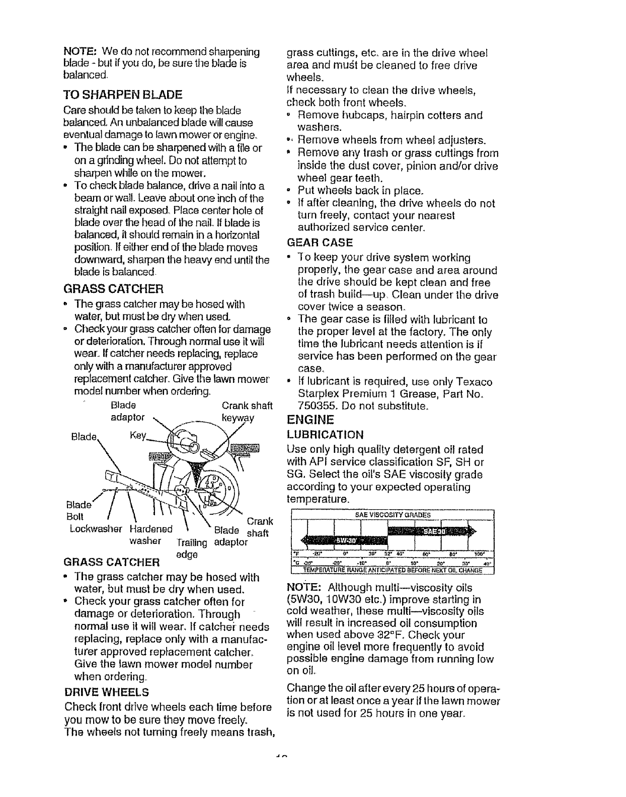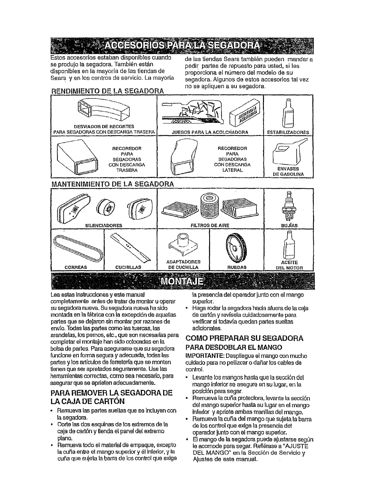 blades, blade adapters, belts, air cleaners and spark plug.