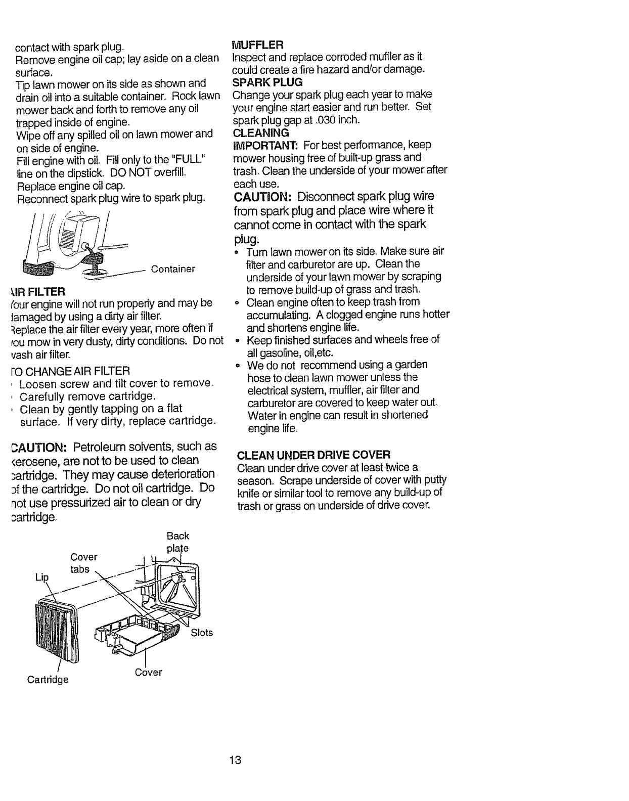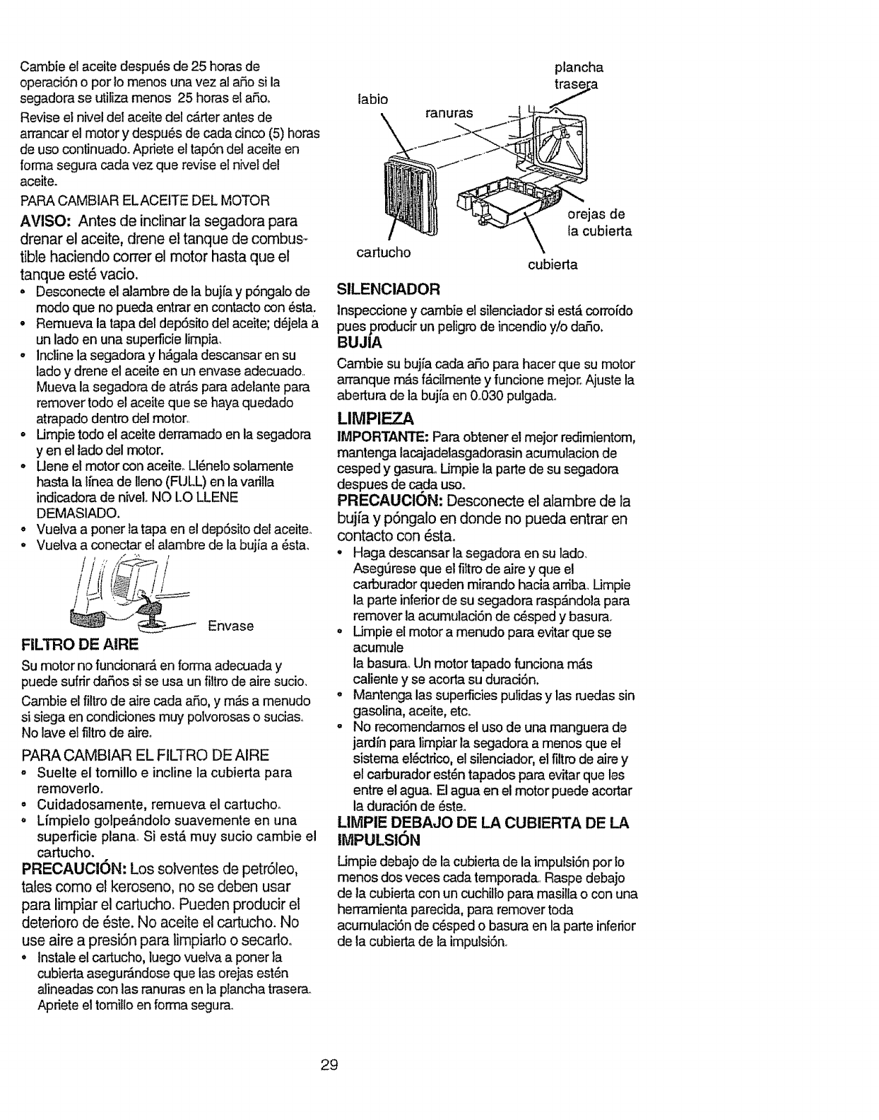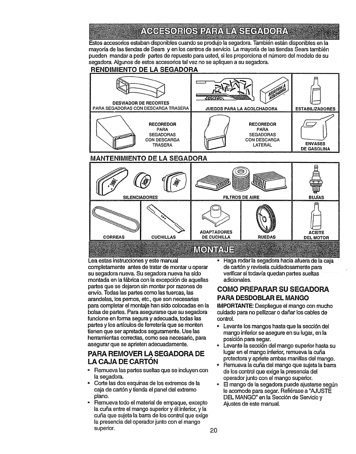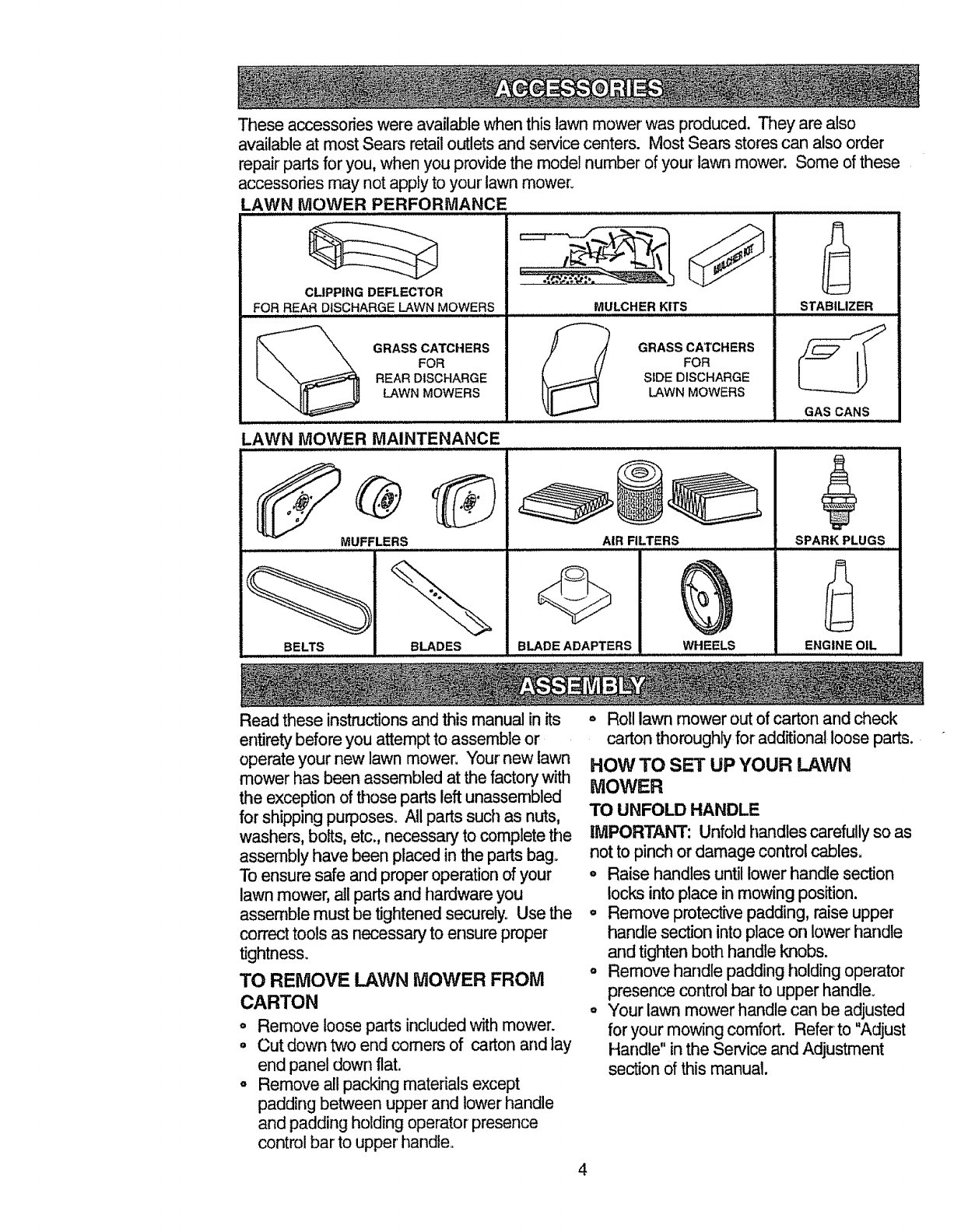 blades, blade adapters, belts, air cleaners and spark plug_