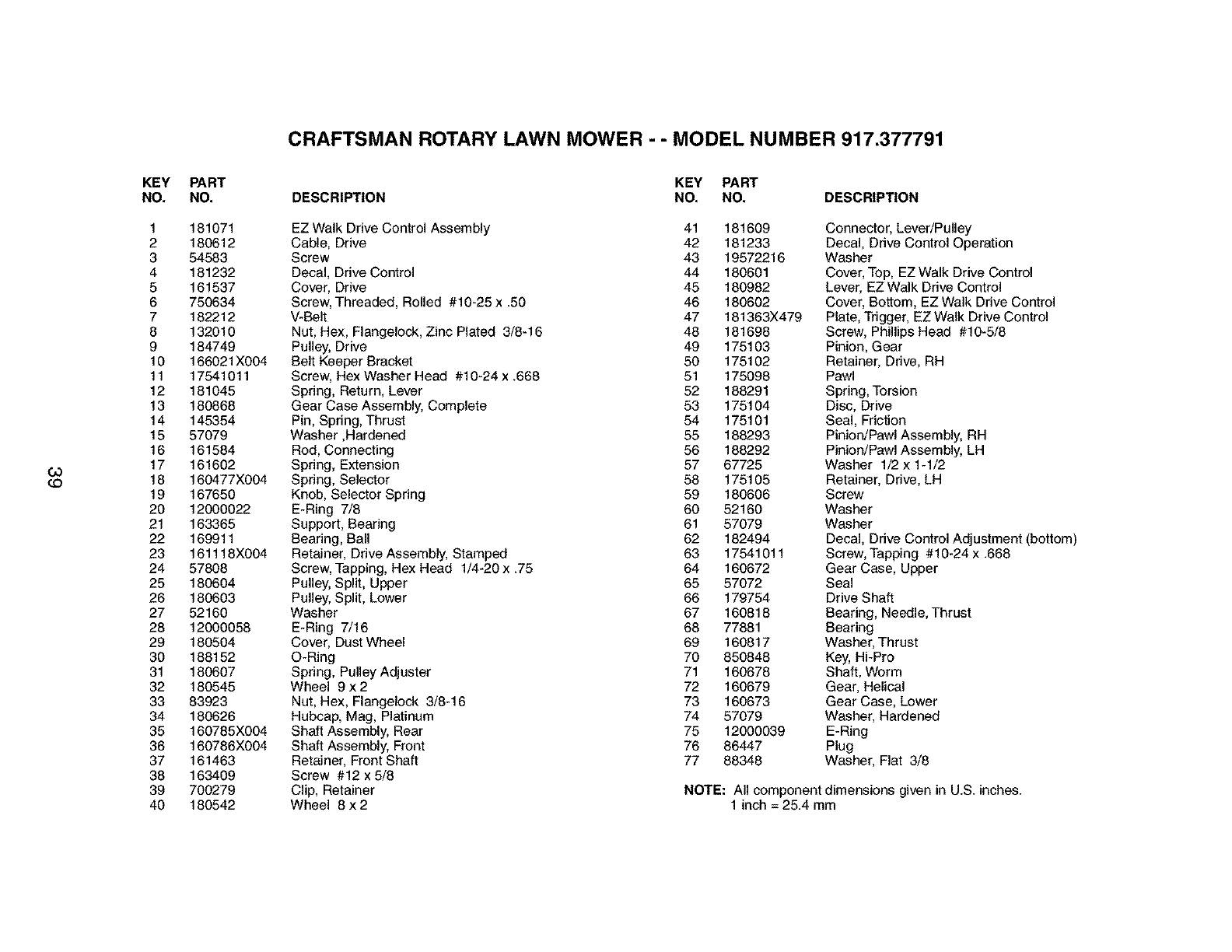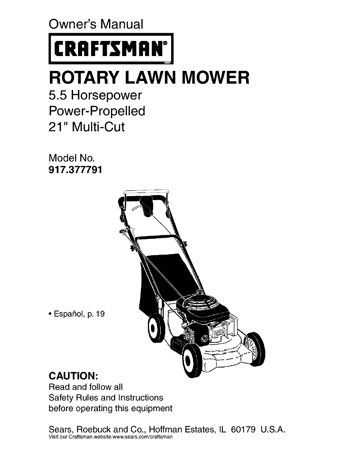 User Manual: Craftsman 917377791 917377791 CRAFTSMAN Gas, Walk Behind Lawnmower - Manuals and Guides View the owners manual for your CRAFTSMAN Gas, Walk Behind Lawnmower #917377791. Home:Lawn & Garden Parts:Craftsman Parts:Craftsman Gas, Walk Behind Lawnmower Manual