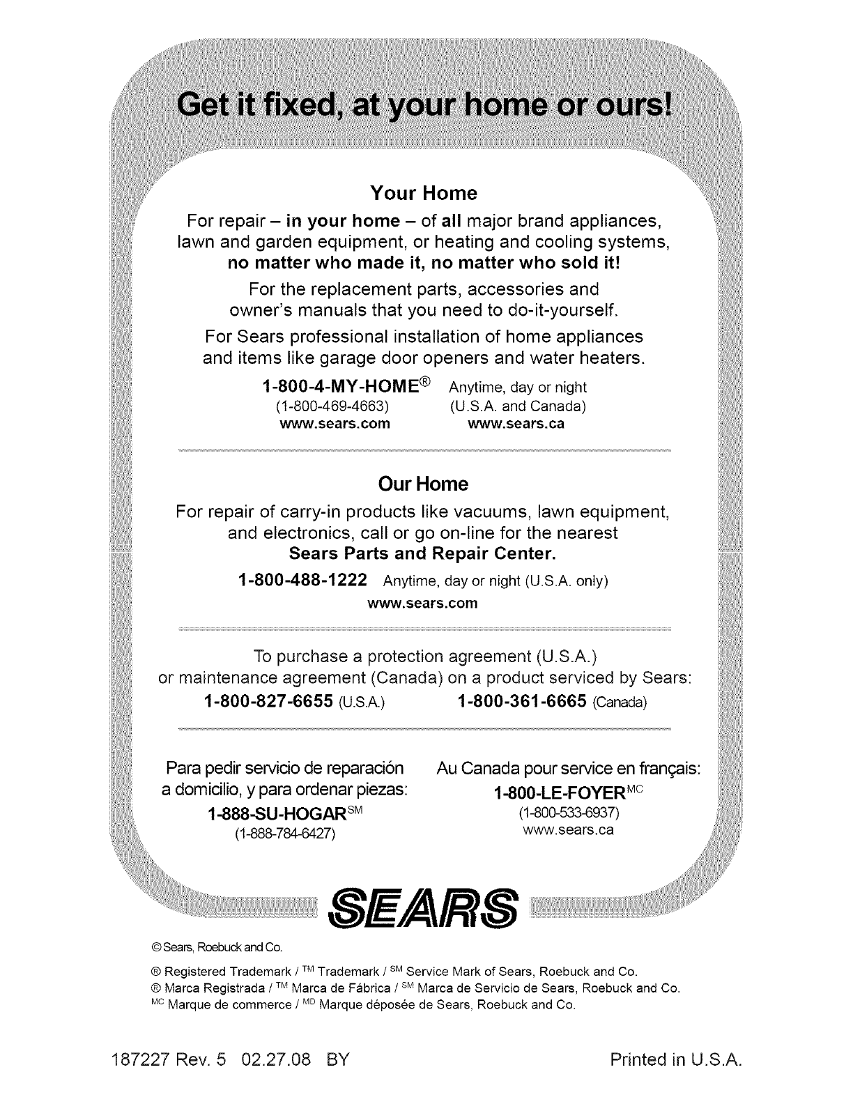 ® Registered Trademark /TMTrademark /SMService Mark of Sears, Roebuck and Co.