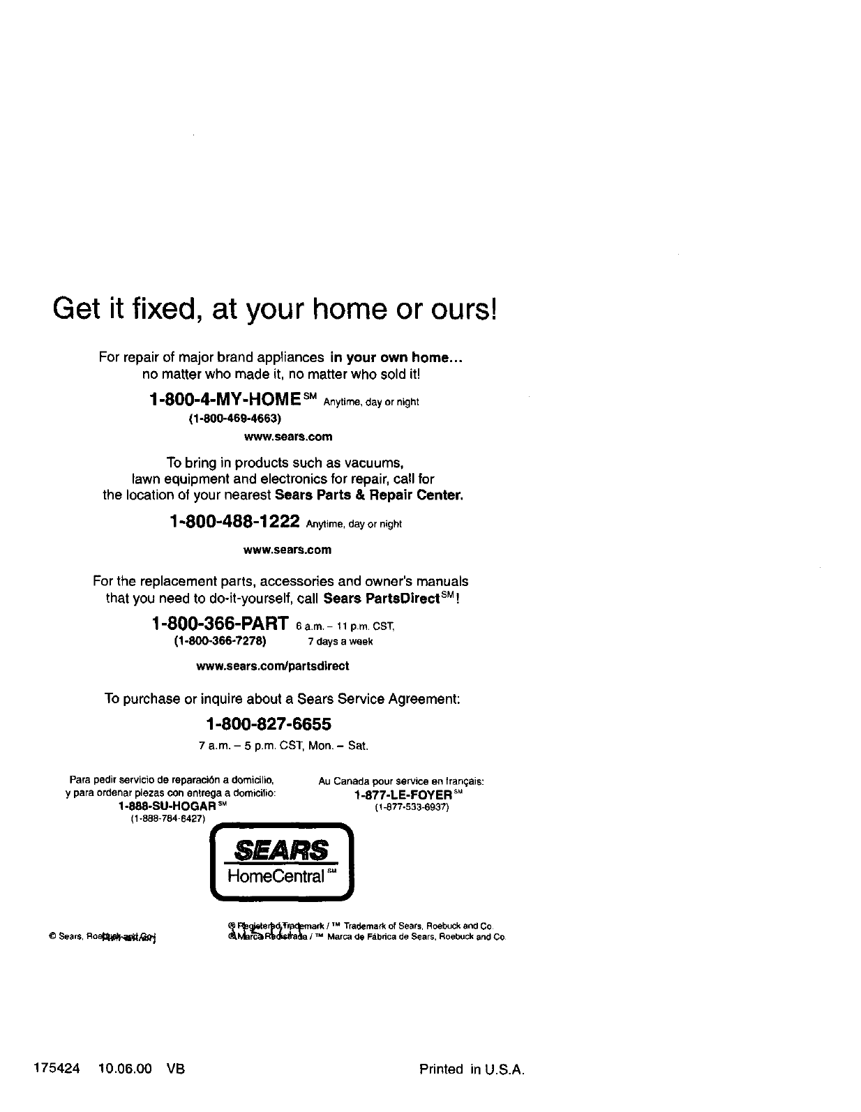 the location of your nearest Sears Parts &Repair Center.