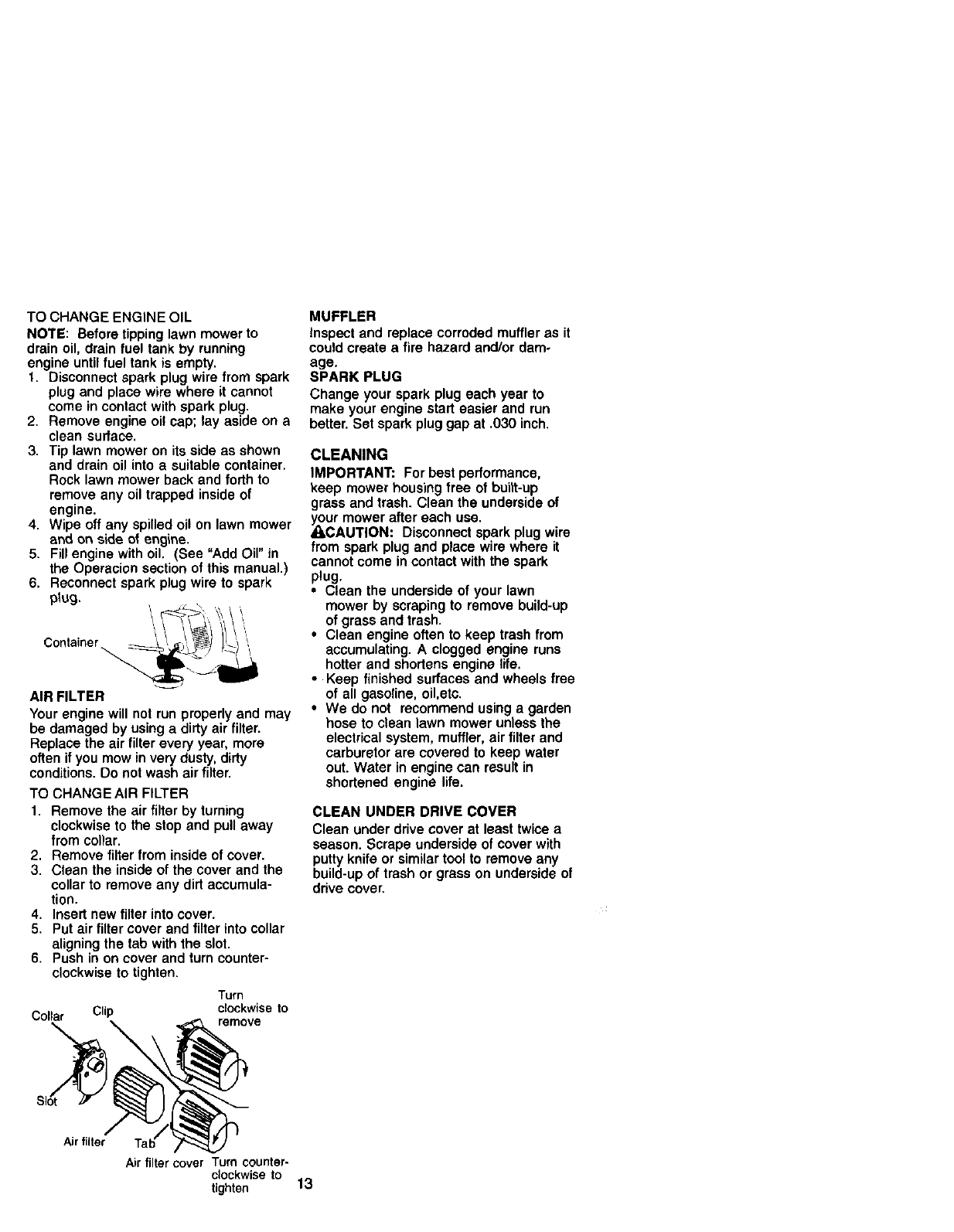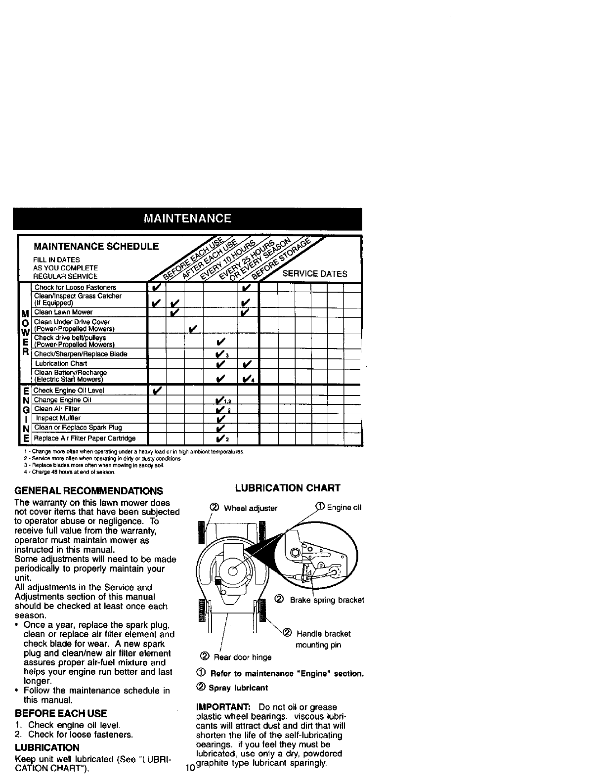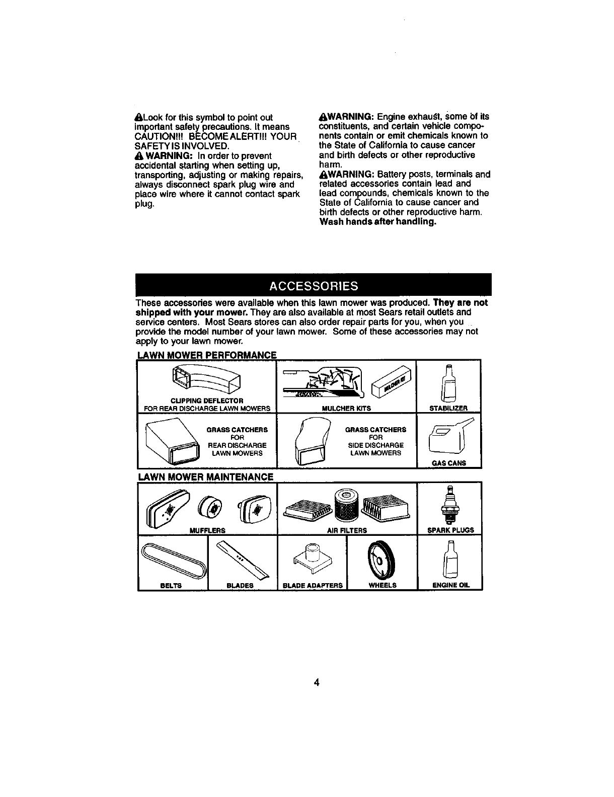 blades, blade adapters,belts, air cleanersand spark plug.