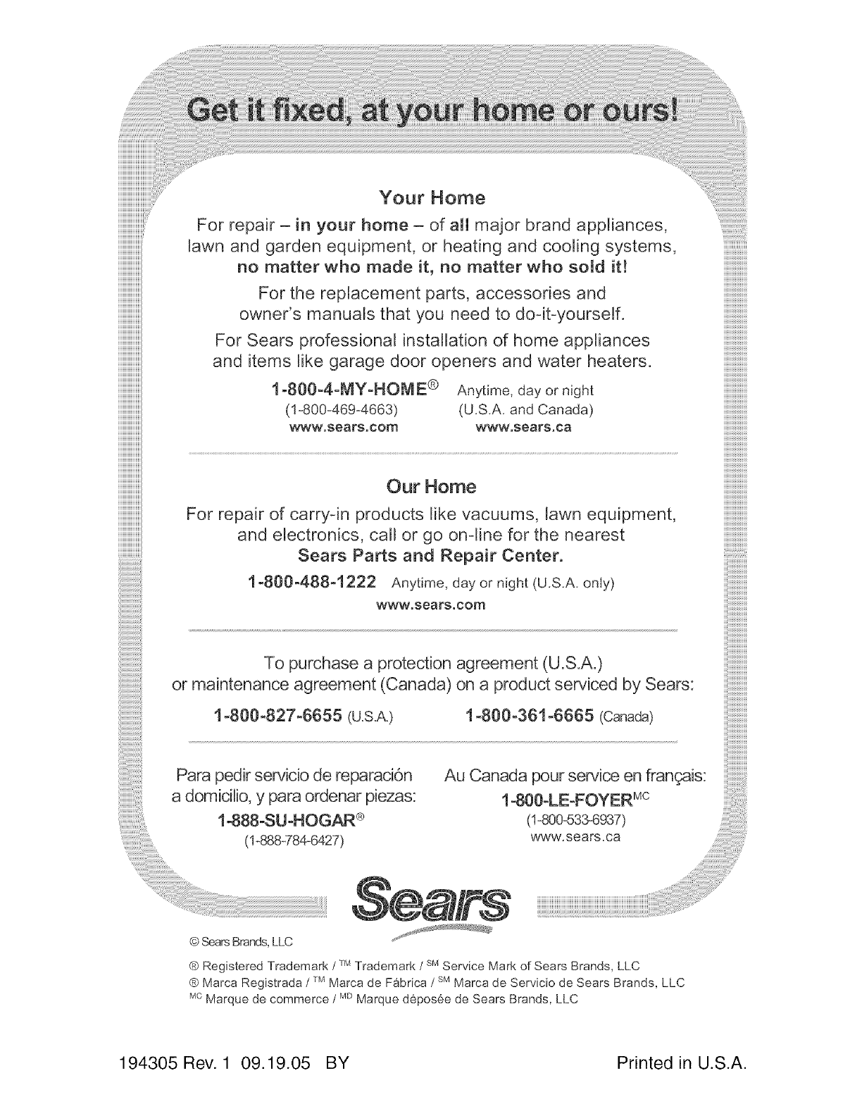 ® Marca Registrada /TMMarca de Fabrica /SMMarca de Servicio de Sears Brands, LLC