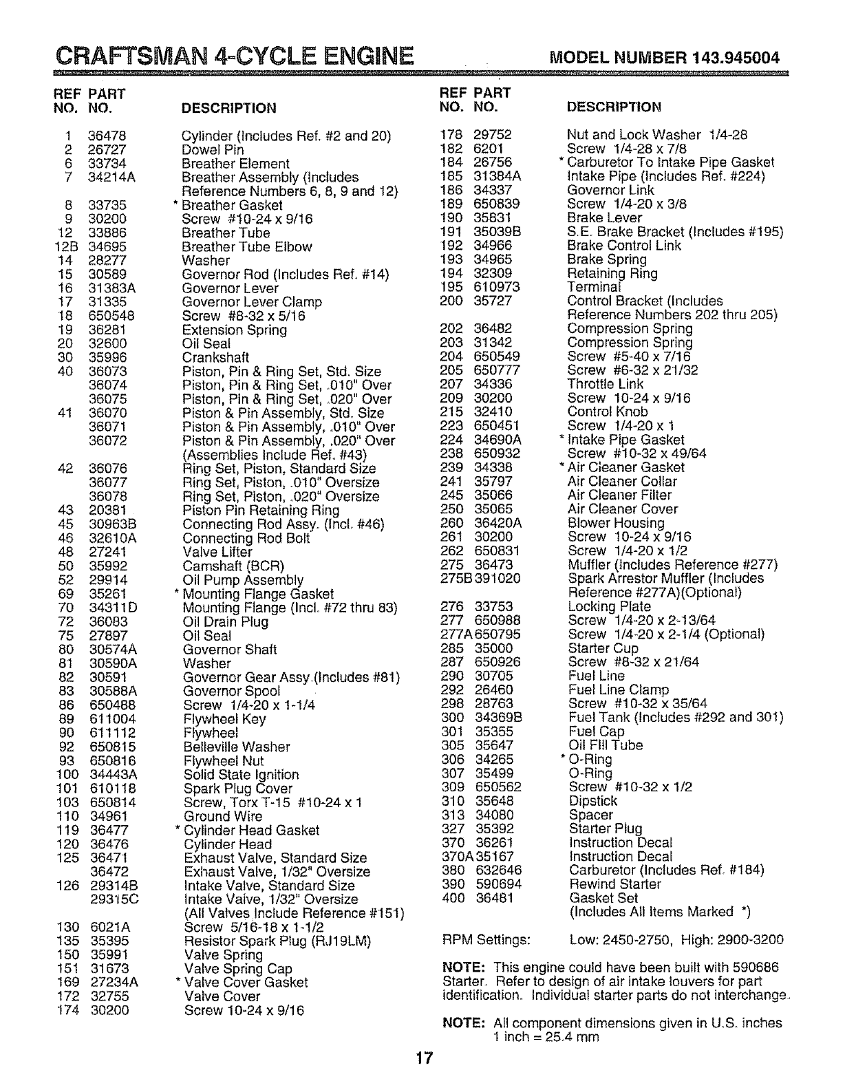 •ENGINE - CRAFTSMAN - MODEL NO. 143.945004