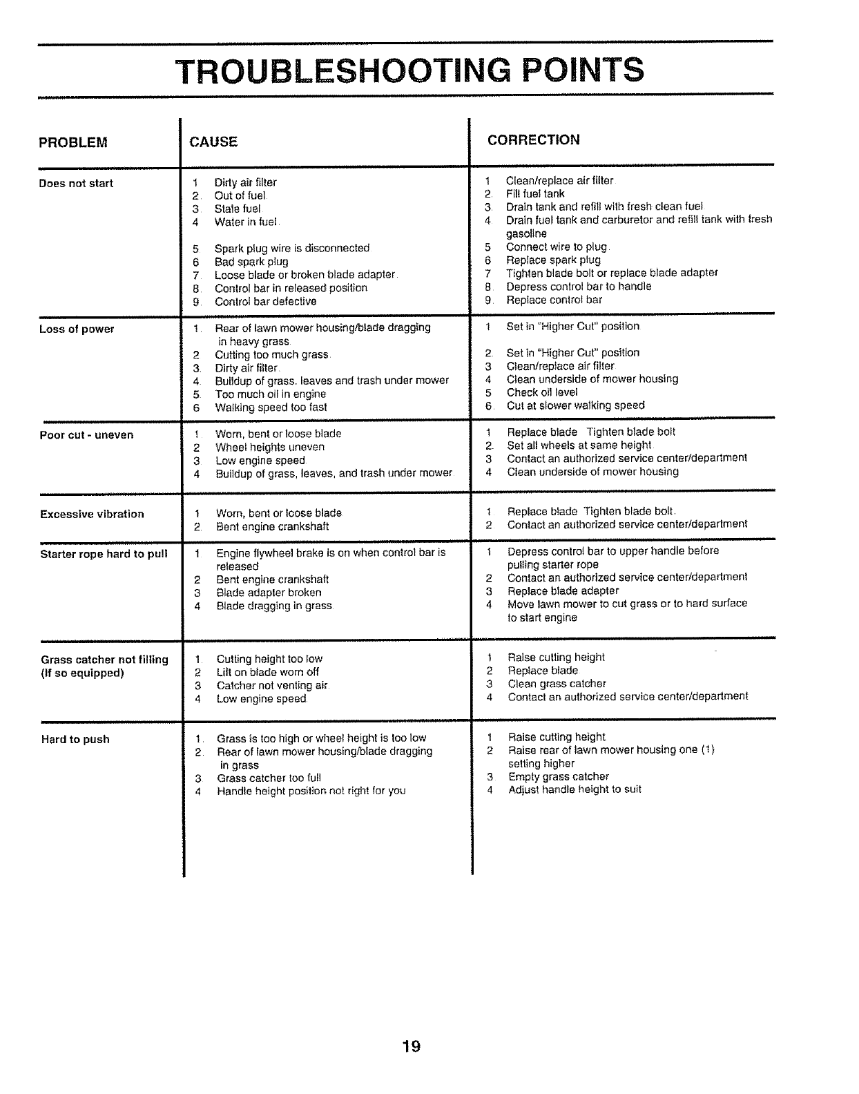 Excessive vibration 1 Worn, bent or loose blade Replace blade Tighten blade bolt