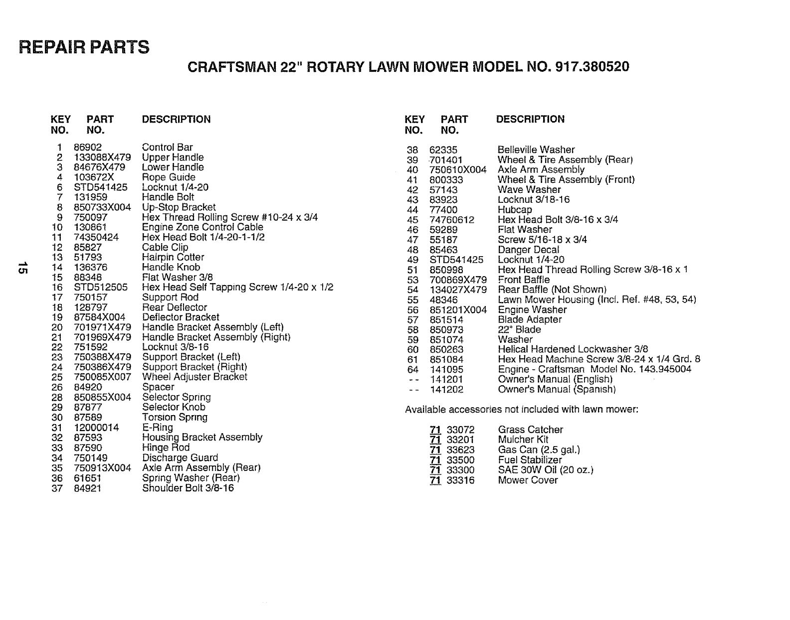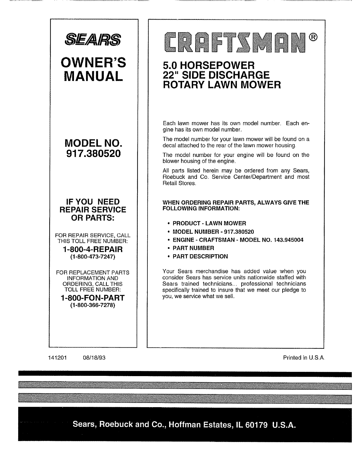 User Manual: Craftsman 917380520 917380520 CRAFTSMAN LAWN MOWER - Manuals and Guides View the owners manual for your CRAFTSMAN LAWN MOWER #917380520. Home:Lawn & Garden Parts:Craftsman Parts:Craftsman LAWN MOWER Manual