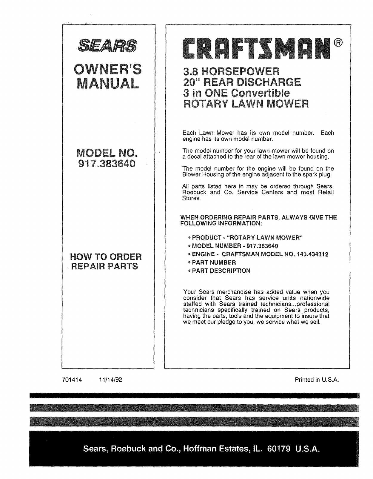 User Manual: Craftsman 917383640 917383640 CRAFTSMAN LAWN MOWER - Manuals and Guides View the owners manual for your CRAFTSMAN LAWN MOWER #917383640. Home:Lawn & Garden Parts:Craftsman Parts:Craftsman LAWN MOWER Manual