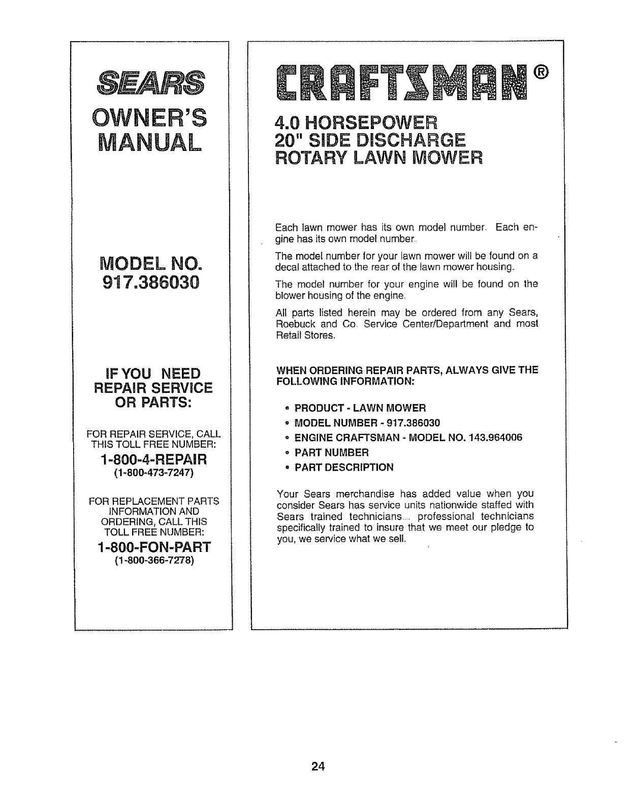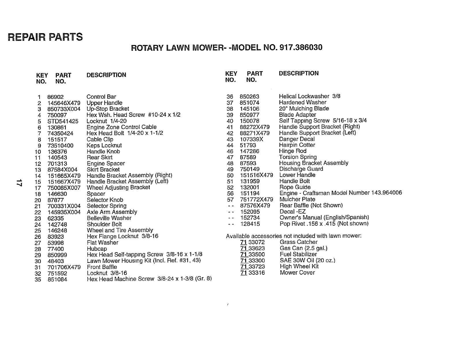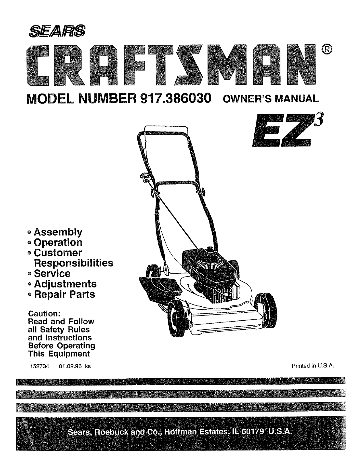 User Manual: Craftsman 917386030 917386030 CRAFTSMAN ROTARY LAWN MOWER - Manuals and Guides View the owners manual for your CRAFTSMAN ROTARY LAWN MOWER #917386030. Home:Lawn & Garden Parts:Craftsman Parts:Craftsman ROTARY LAWN MOWER Manual