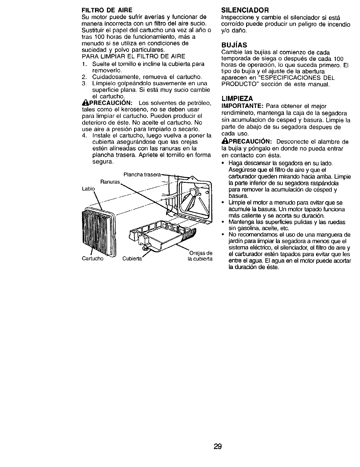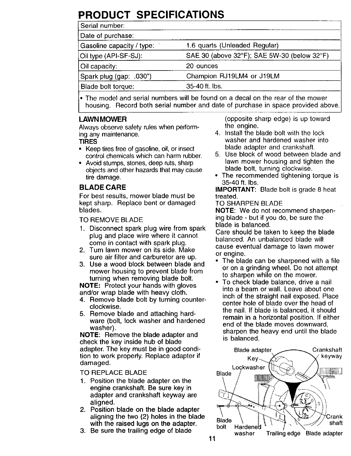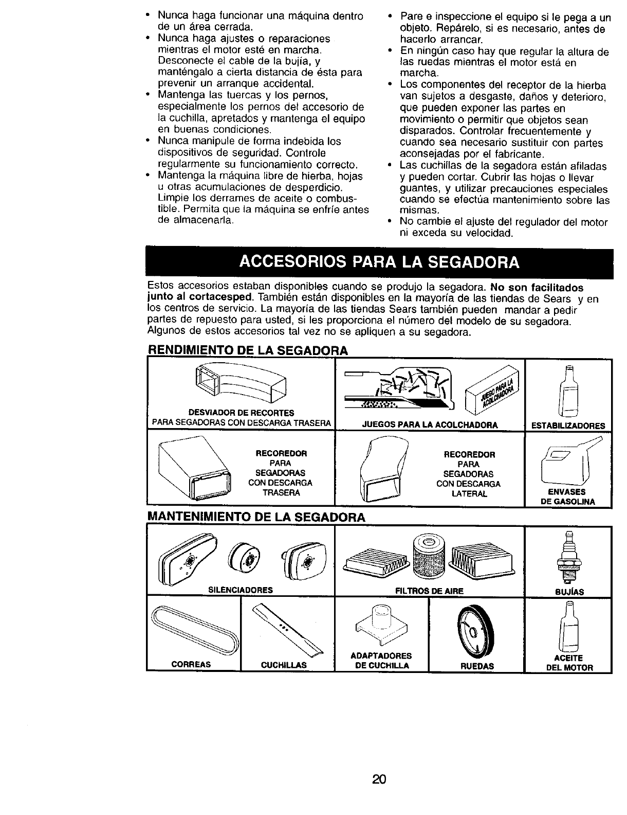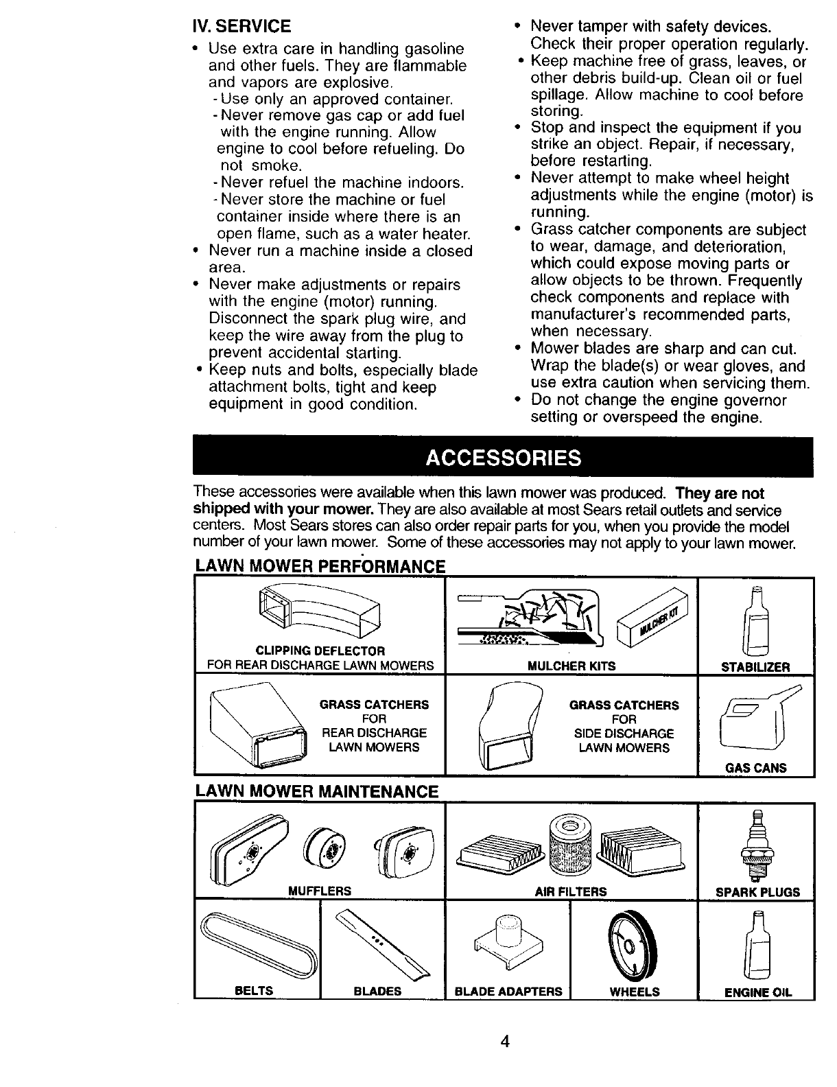 blades, blade adapters, belts, air cleaners and spark plug.