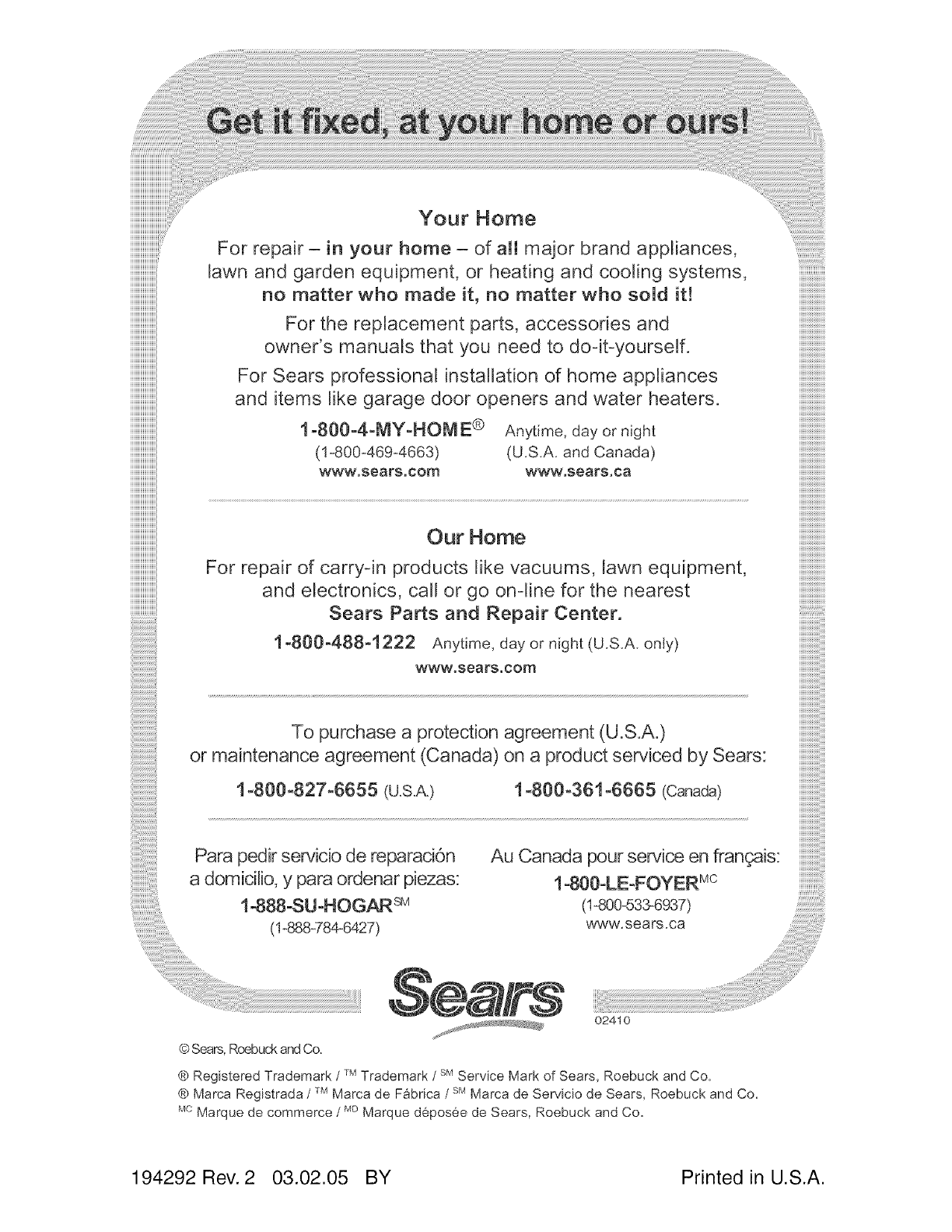 ® Registered Trademark /TMTrademark /sM Service Mark of Sears, Roebuck and Co.