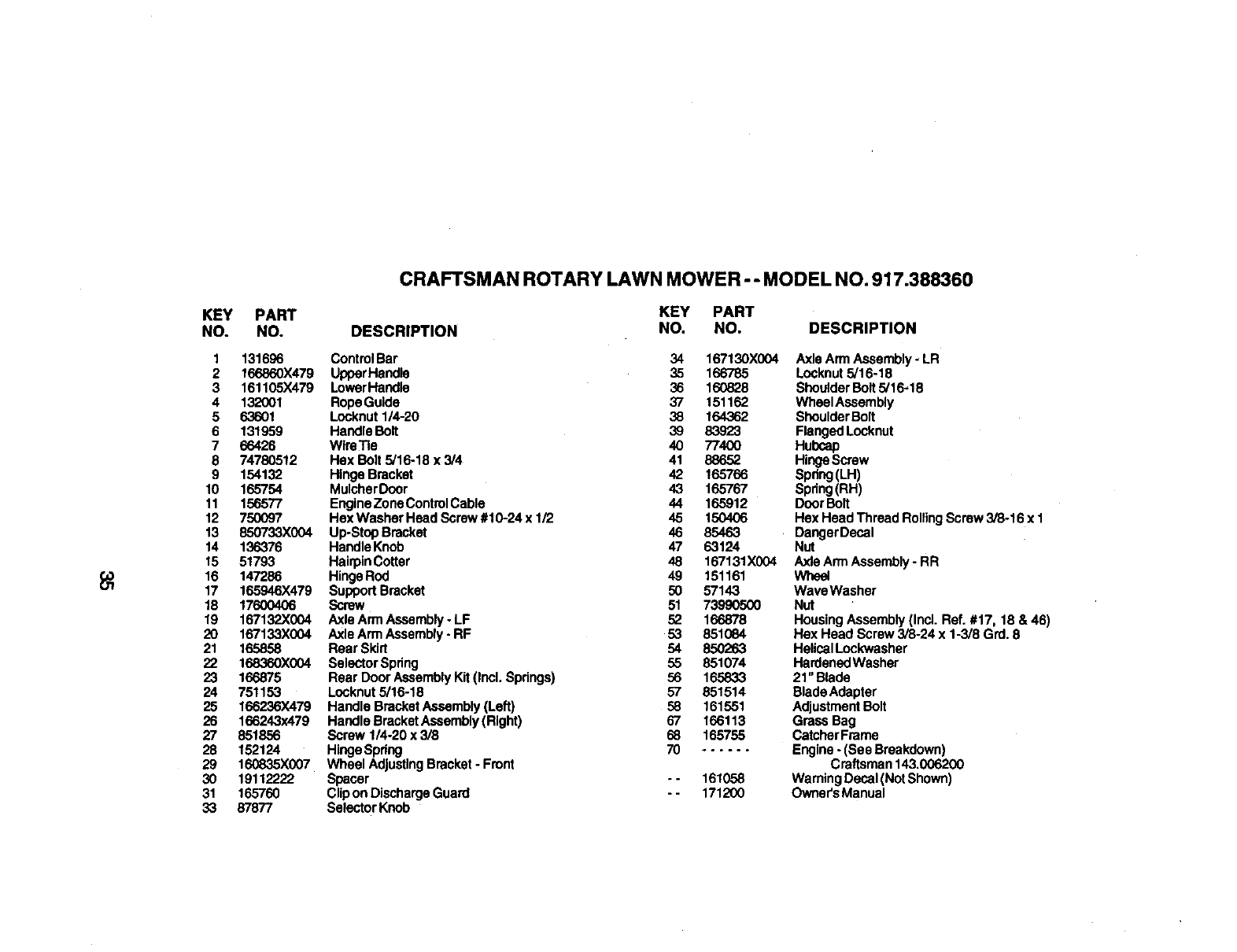 User Manual: Craftsman 917388360 917388360 CRAFTSMAN CRAFTSMAN 6.25HP 21 ROTARY LAWN MOWER - Manuals and Guides View the owners manual for your CRAFTSMAN CRAFTSMAN 6.25HP 21 ROTARY LAWN MOWER #917388360. Home:Lawn & Garden Parts:Craftsman Parts:Craftsman CRAFTSMAN 6.25HP 21 ROTARY LAWN MOWER Manual