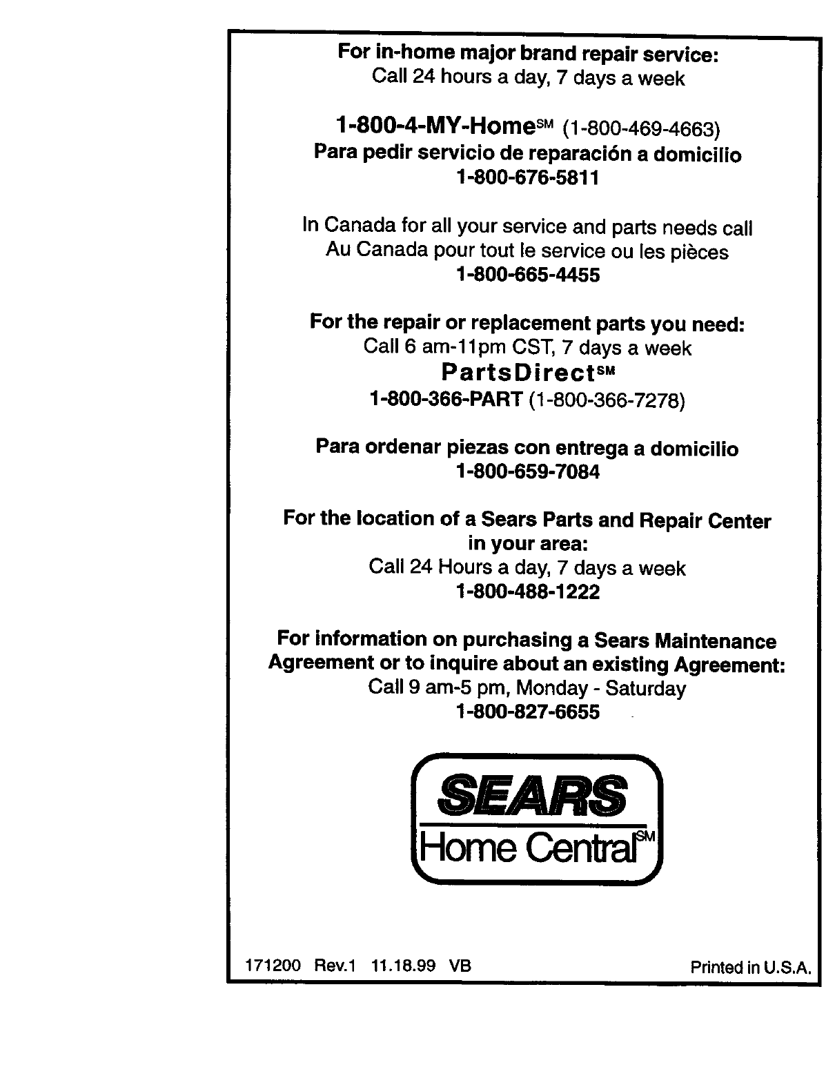 Sears Service Center/Depadment in the United States. This warranty applies only