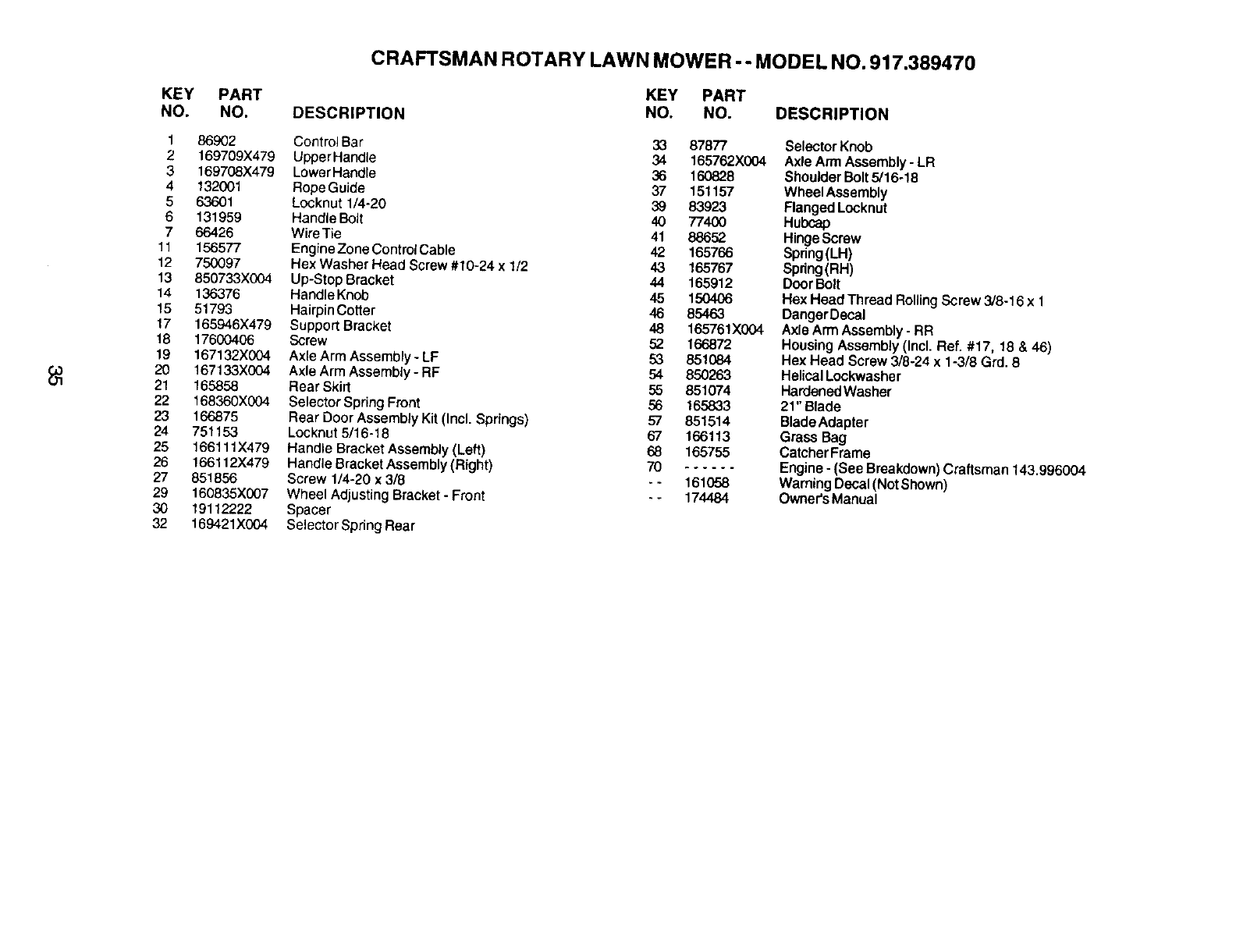 User Manual: Craftsman 917389470 917389470 CRAFTSMAN Gas, Walk Behind Lawnmower - Manuals and Guides View the owners manual for your CRAFTSMAN Gas, Walk Behind Lawnmower #917389470. Home:Lawn & Garden Parts:Craftsman Parts:Craftsman Gas, Walk Behind Lawnmower Manual