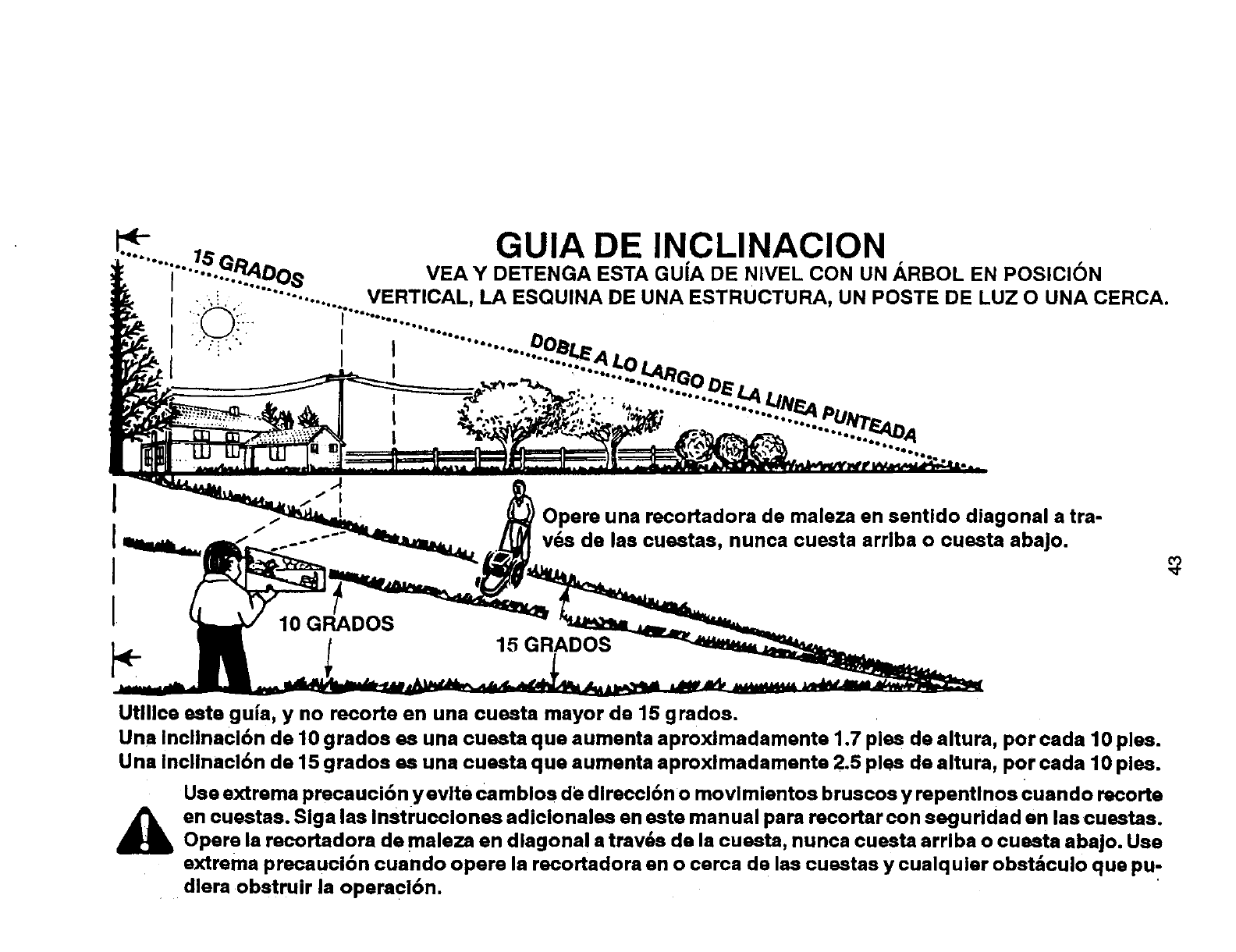 Opera la recortadora de maleza en diagonal atrav6s de la cuesta, nunca cuesta arrlba o cuesta abajo. Use