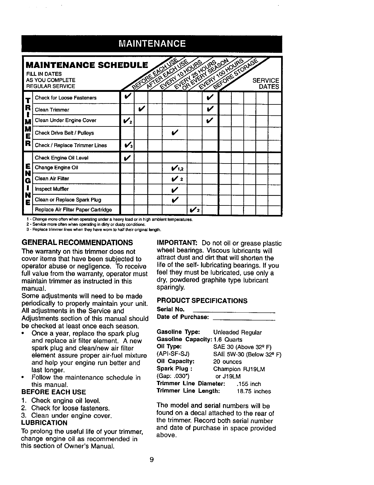 belts, air cleaners and spark plug.