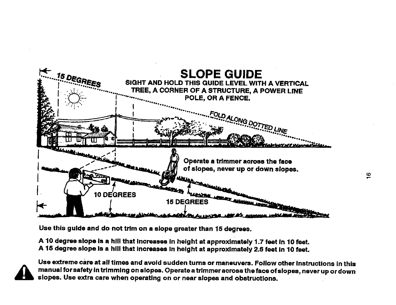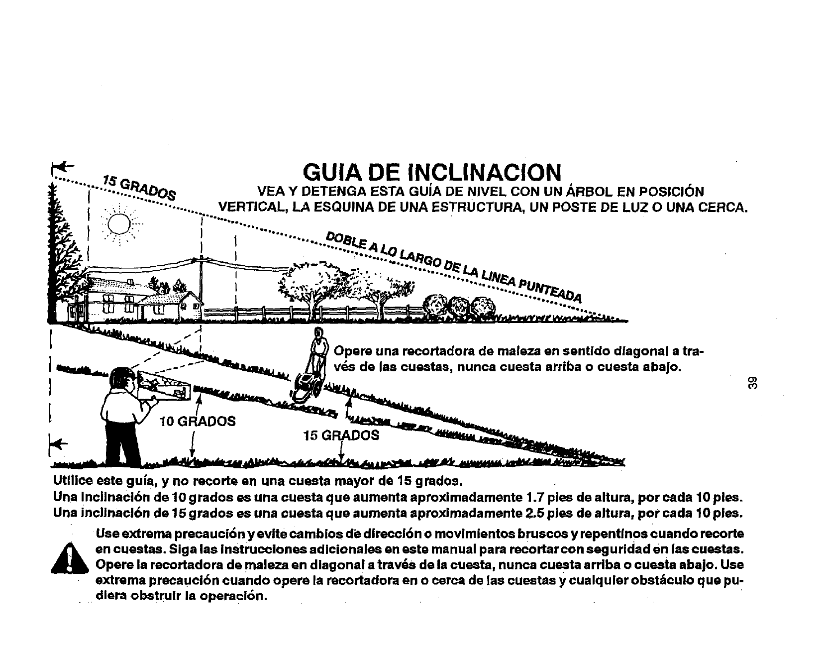Opera la racortadora de maleza en diagonal atrav6s de la cuesta, nunca cuesta arriba o cuesta abajo. Use