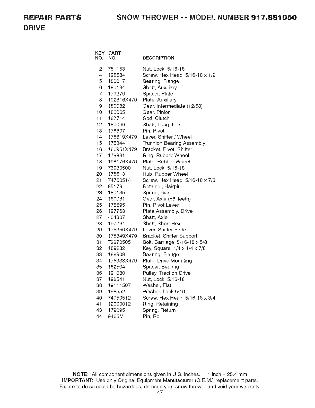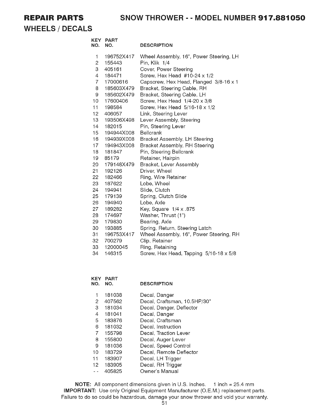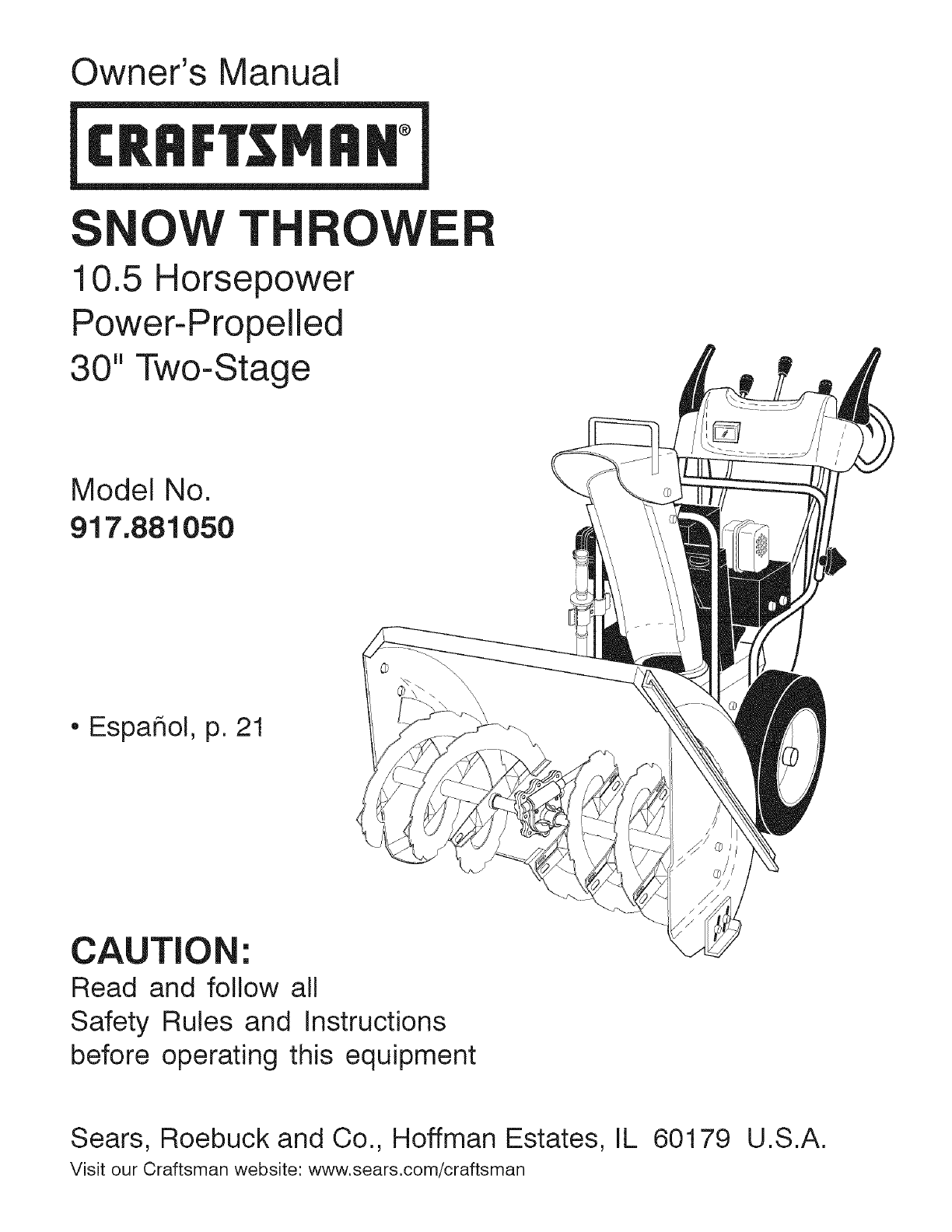 User Manual: Craftsman 917881050 917881050 CRAFTSMAN SNOW THROWER - Manuals and Guides View the owners manual for your CRAFTSMAN SNOW THROWER #917881050. Home:Lawn & Garden Parts:Craftsman Parts:Craftsman SNOW THROWER Manual